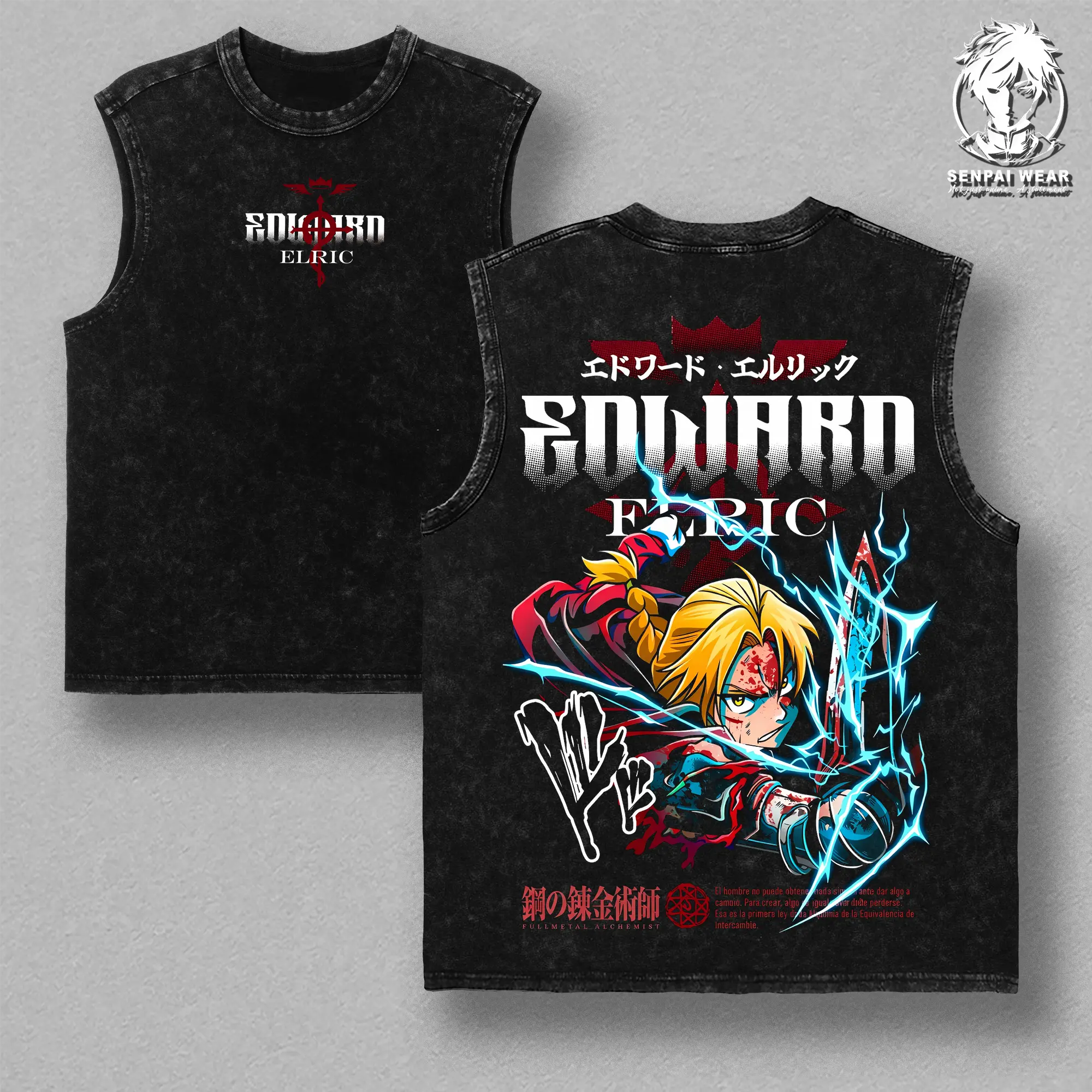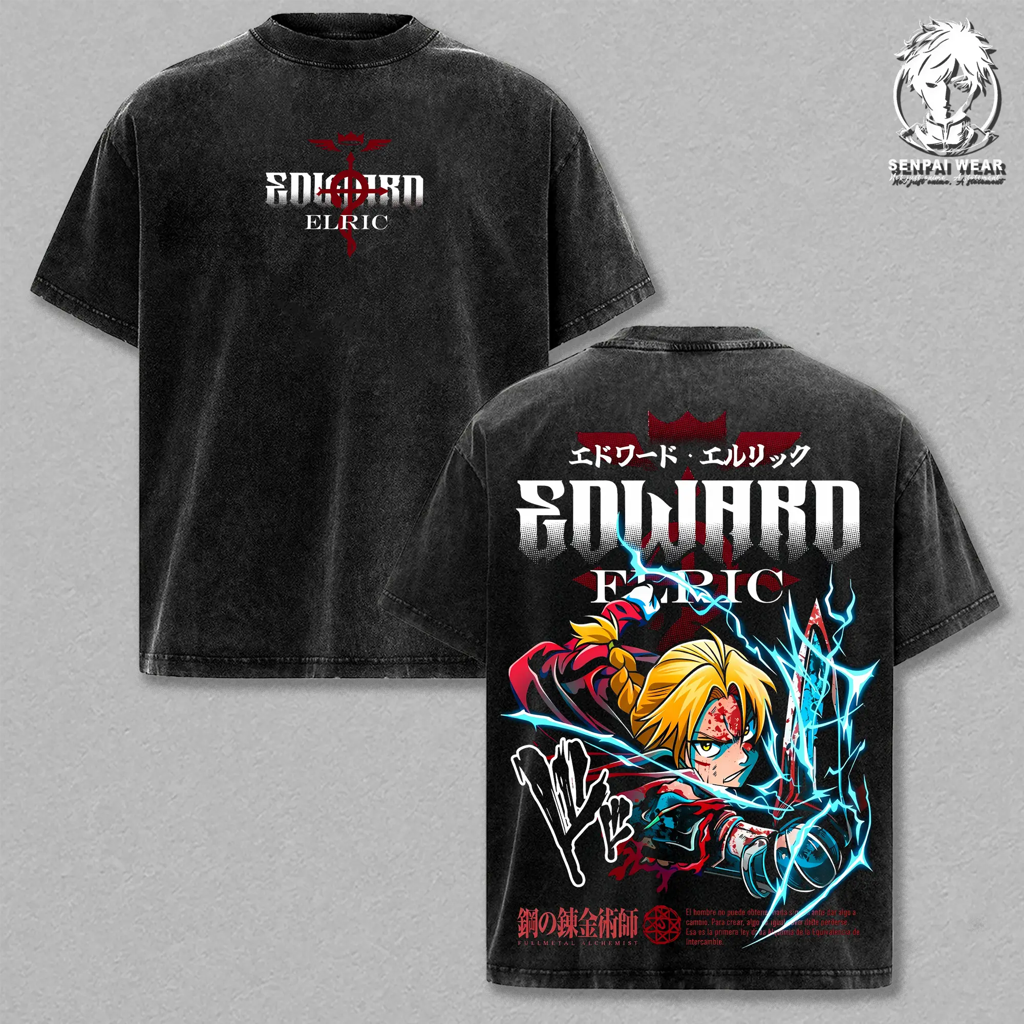 Edward Elric Alchemist Oversized T-Shirt – FMA Anime Vintage Washed Double Printed Graphic Tee, Heavy Cotton Unisex Streetwear Top, Gift for Anime Fans