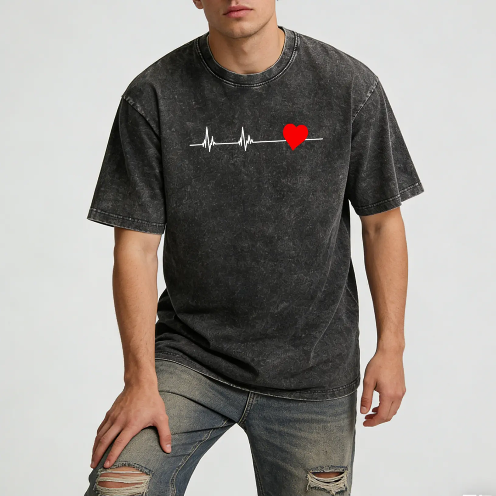 Comfort Fit Washed T-Shirt with Heartbeat Design Supporting Heart Disease Awareness