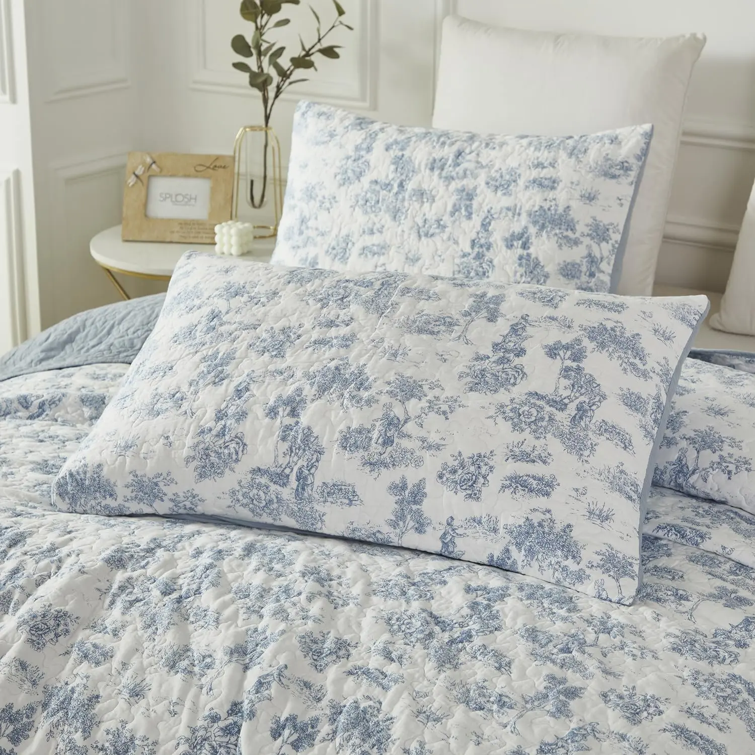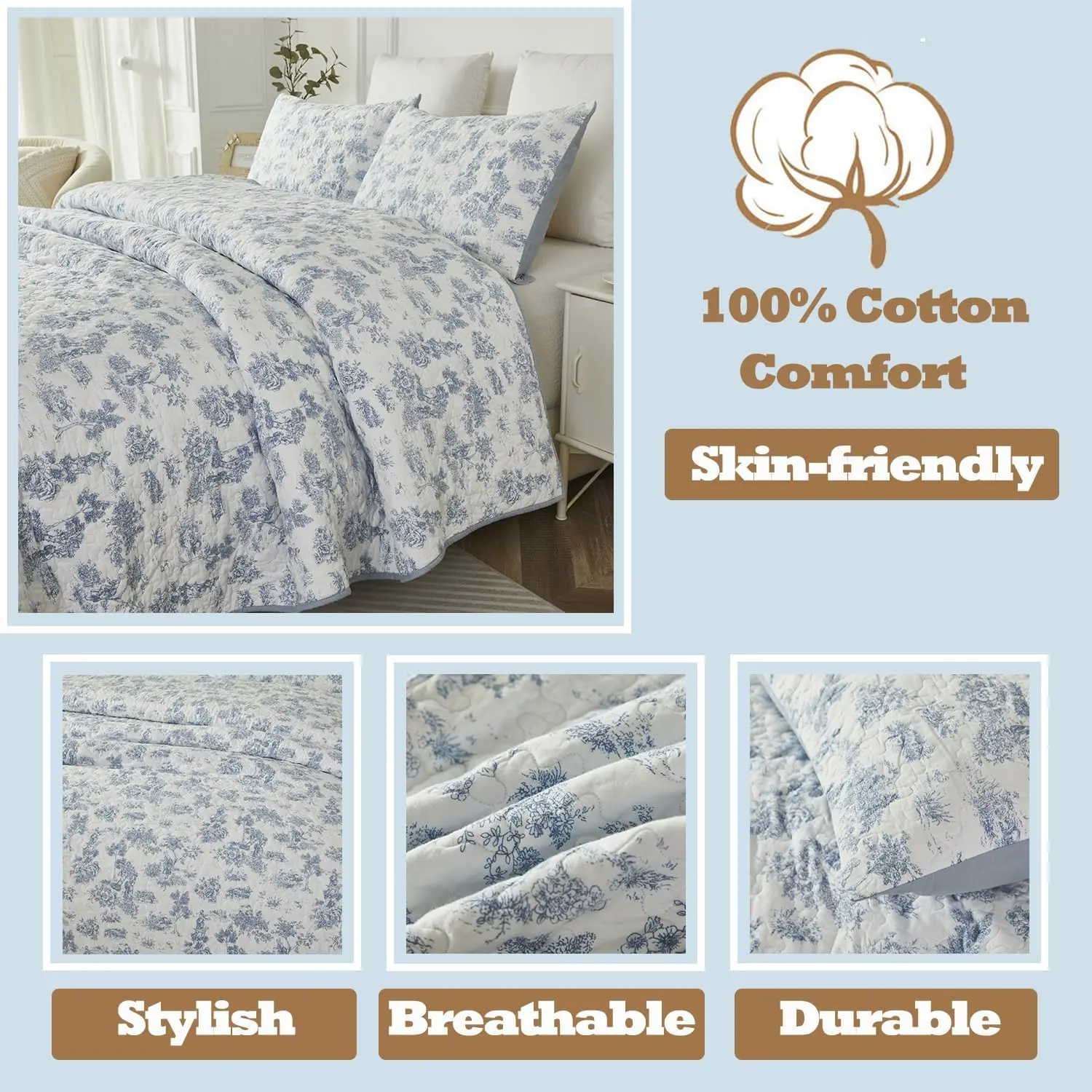 Classic Toile Pattern:Features a timeless blue and white toile design, depicting elegant pastoral scenes.This versatile set enhances both traditional and modern décor with its clean lines and tranquil color palette.Ideal for adding a refined touch to any room, this quilt set offers both beauty and comfort, perfect for everyday use or as a decorative piece.LIGHTWEIGHT & BREATHABLE - Material: 100%Cotton high-density fabric, super comfortable and soft!Twin size quilt set(2PCs): 1 quilt/coverlet for Twin/Single size bed or daybed, 1 standard size pillow sham 20*27 inchLightweight All-Season Quilt: Perfect for layering during colder months or using on its own in warmer weather.Care Instructions: Machine washable in cold Gentle Cycle for easy care.Tumble dry on low for softness and durability.
