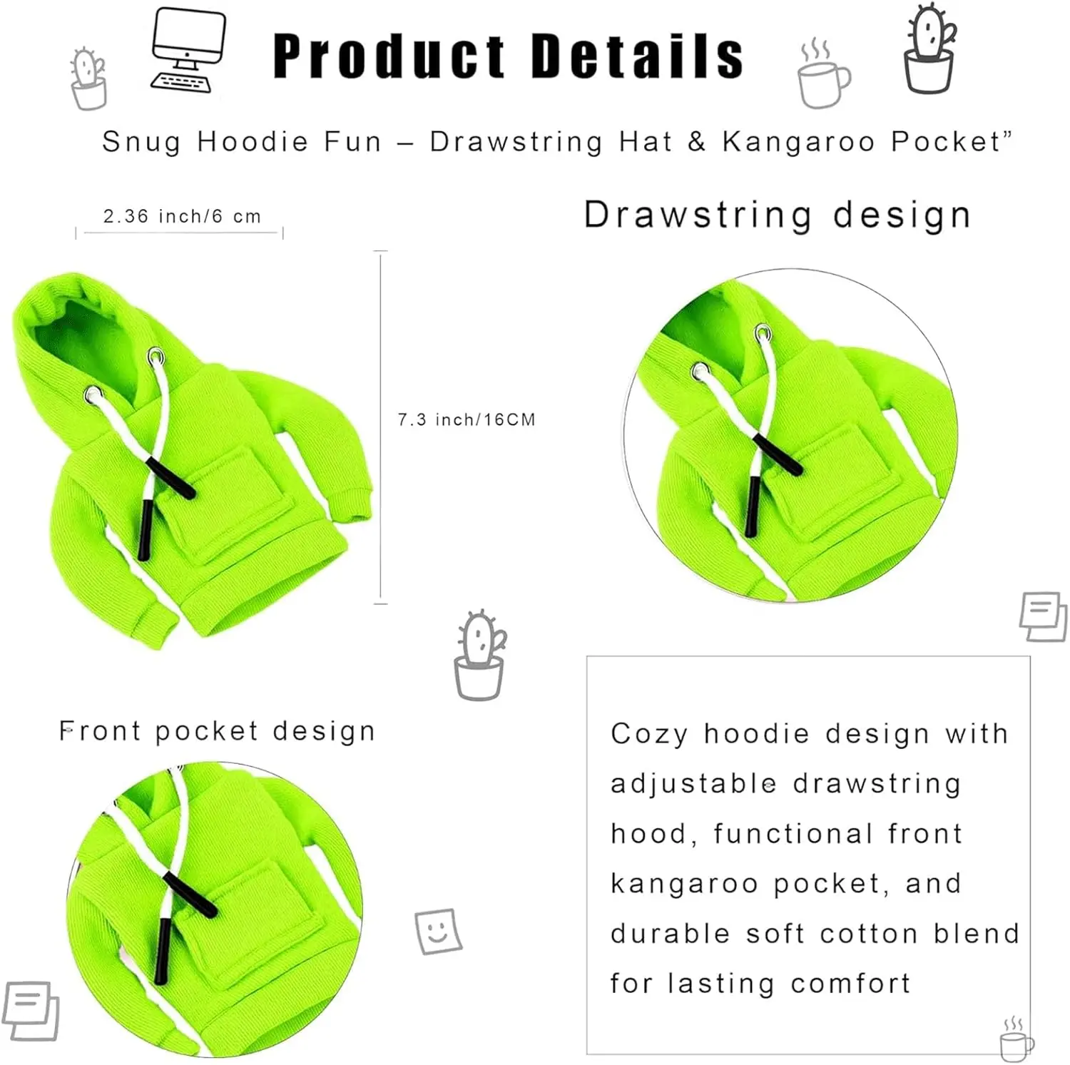 Includes a cozy hoodie with an adjustable hood for your porch goose. Mix and match with other accessories to create fun and unique styles for your desk.