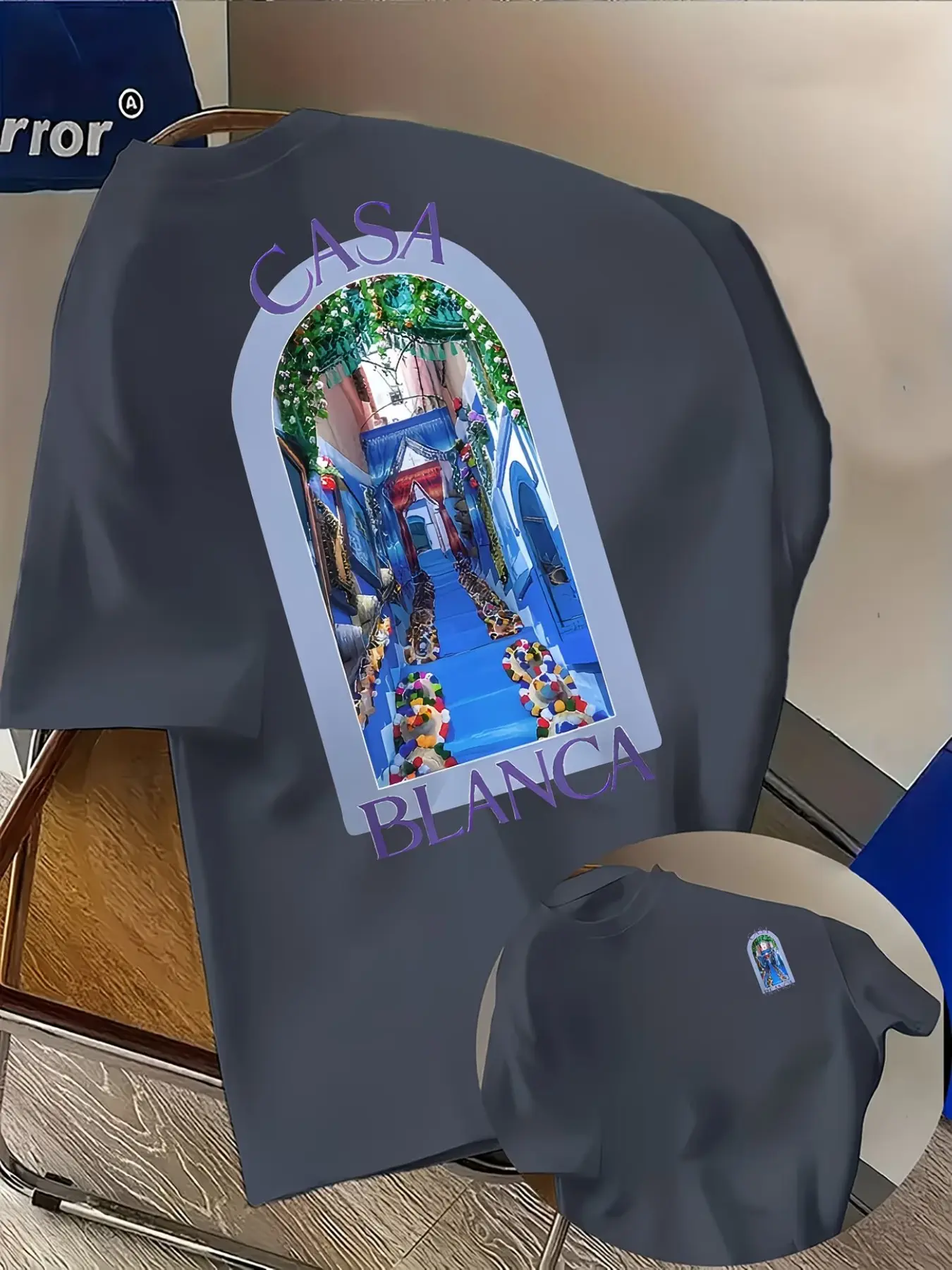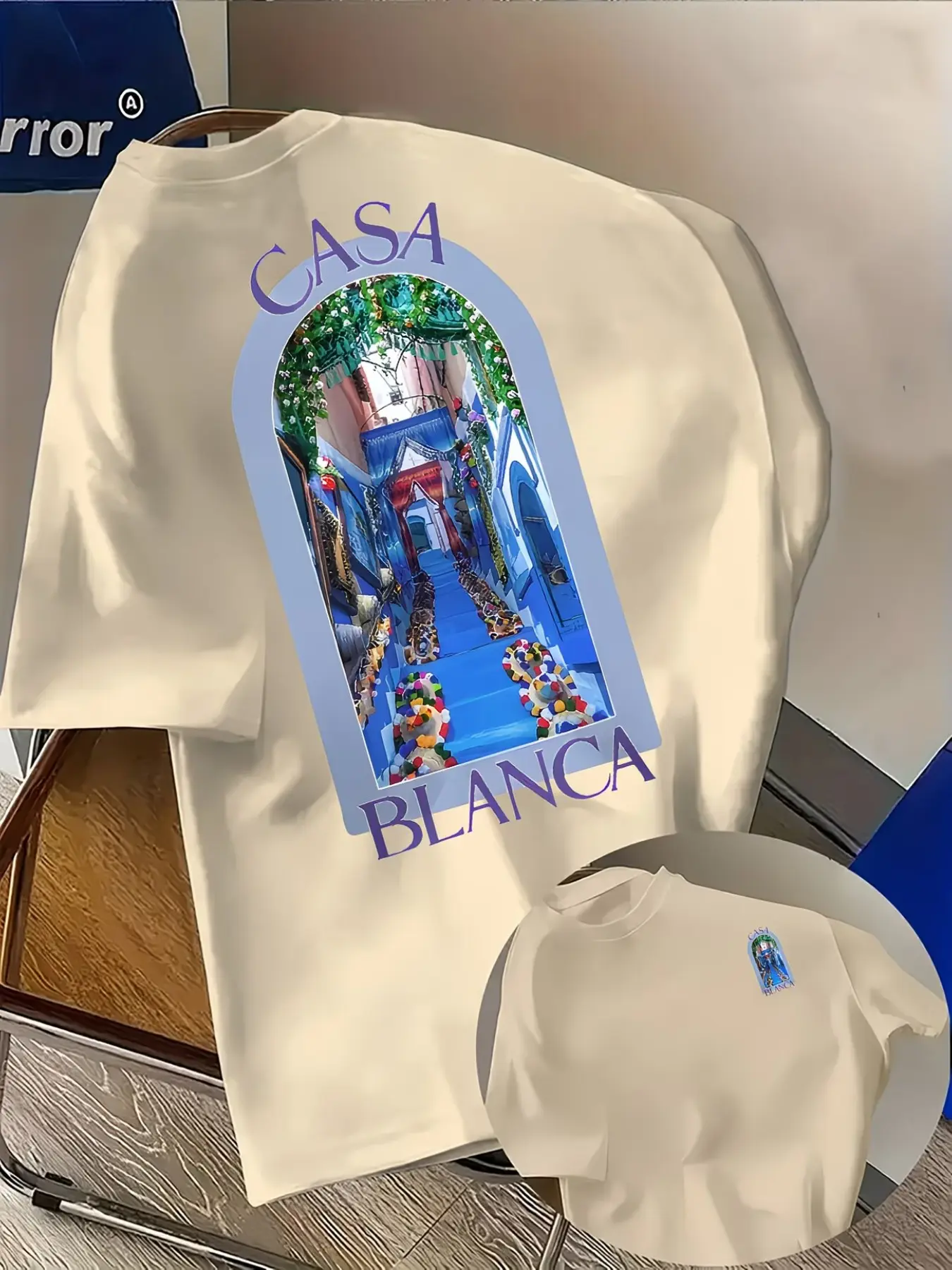 Men's Casual Short Sleeve T-Shirt, Casablanca Letter Print, Round Neck Summer Top, Fitted, Durable Fabric