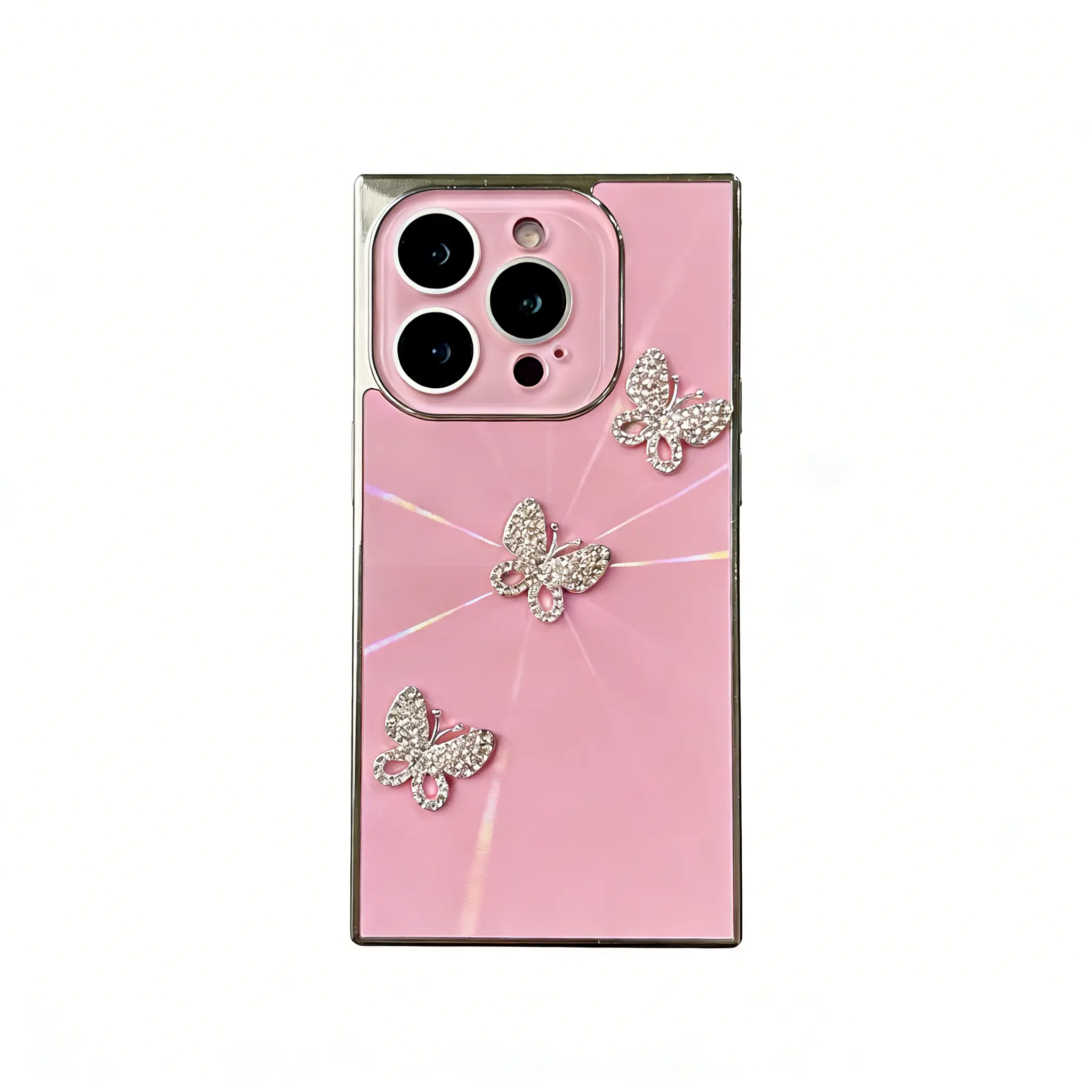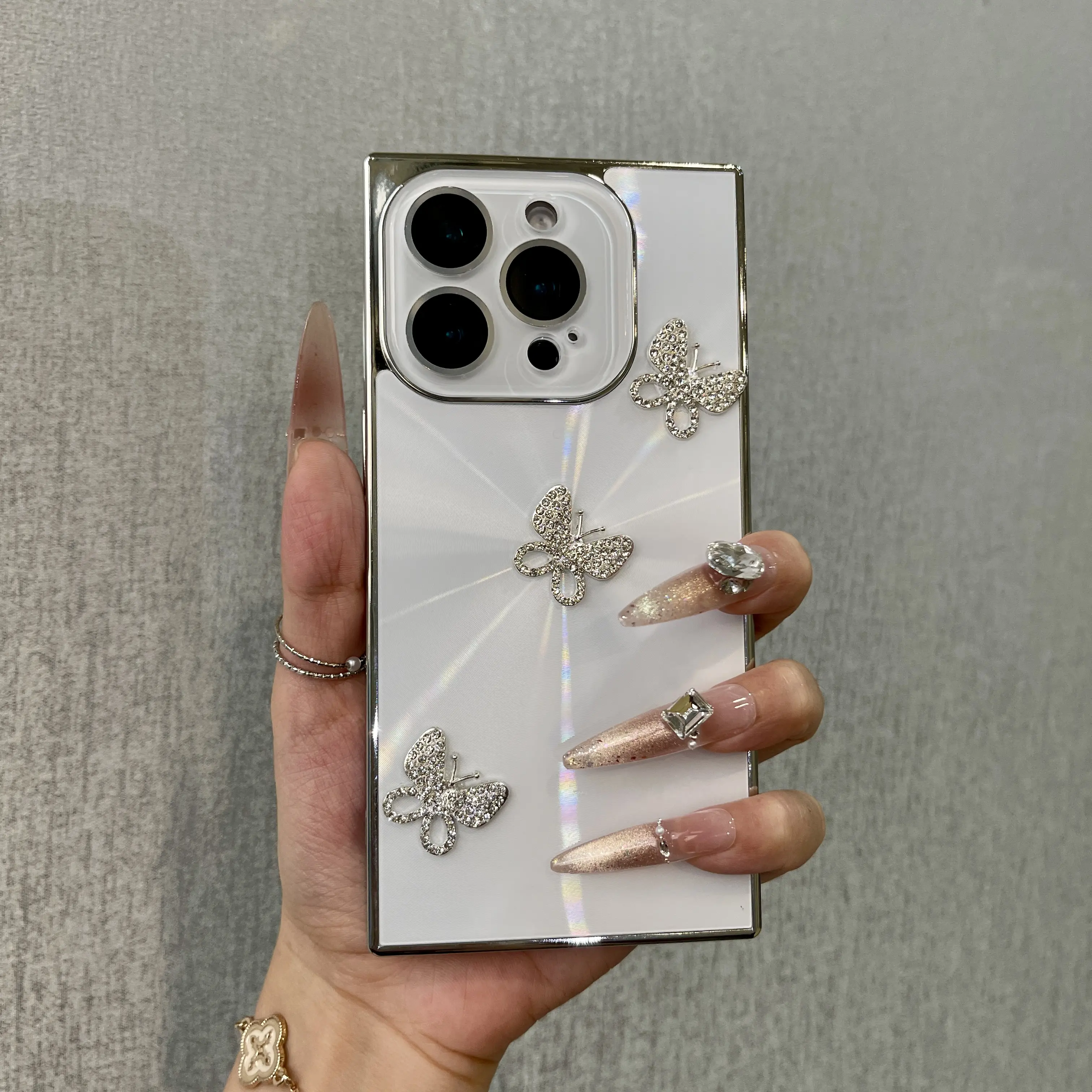 Luxury 3D Rhinestone Butterfly Square Edge Phone Case, Bling Glitter Electroplated Full Camera Protection Shockproof Cover for junk