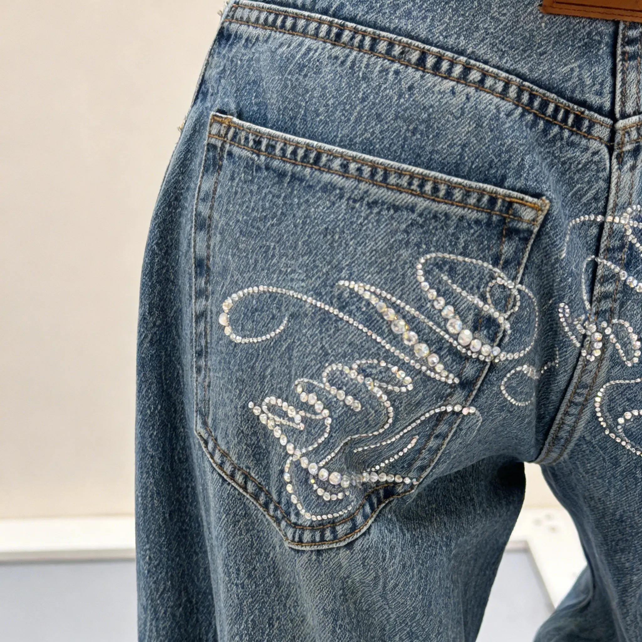 ·Retro Style: These jeans embody the Y2K aesthetic with rhinestone embroidery, perfect for a 90s streetwear vibe. 🎨