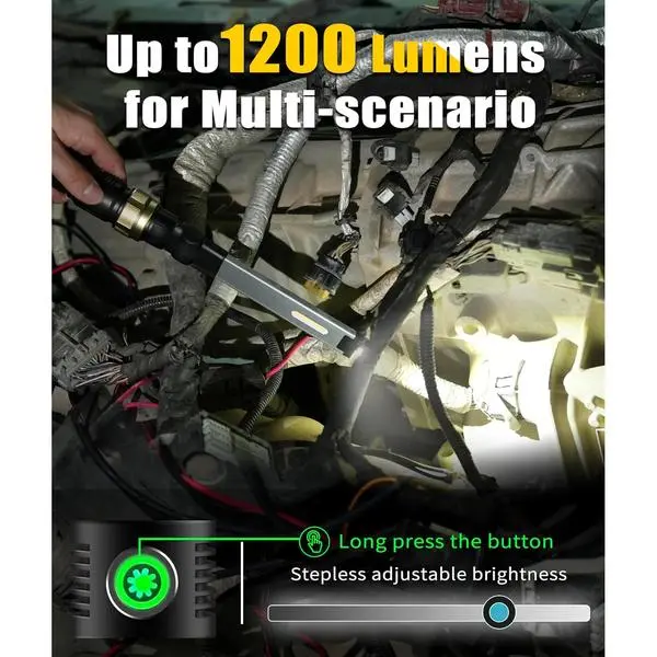 Producing 1200 lumens, this mechanic light has three light sources: White Light Bar, Warm Light Bar, and Front Flashlight. With stepless brightness adjustment, it illuminates 90% of the repair environment, ensuring no detail is missed.