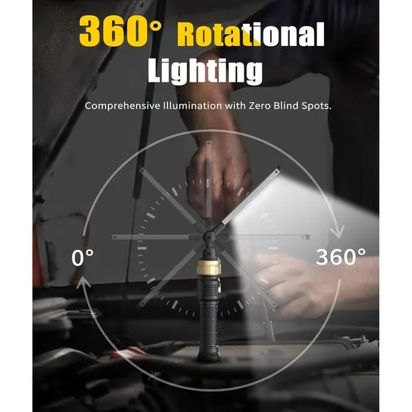 The magnetic work light boasts a 360° vertical and 180° horizontal rotation, offering multi-angle illumination. Its compact foldable dimensions of 7 x 1.4 inches make it portable, perfect for lighting up any workspace. Carry it anywhere for reliable illumination.