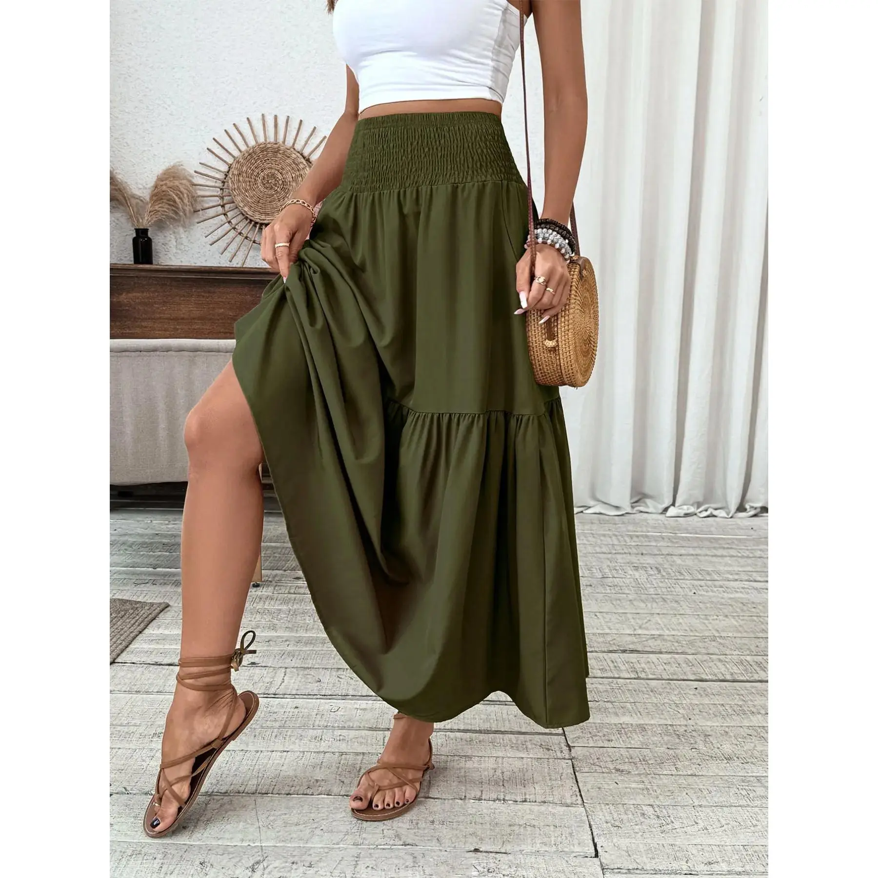 Women's Floral Chic Casual A-Line Ruffled Skirt, Elastic Waist Pockets, Leaf Hem, Long Fitted Skirt, Fashionable Mid-Length Dress