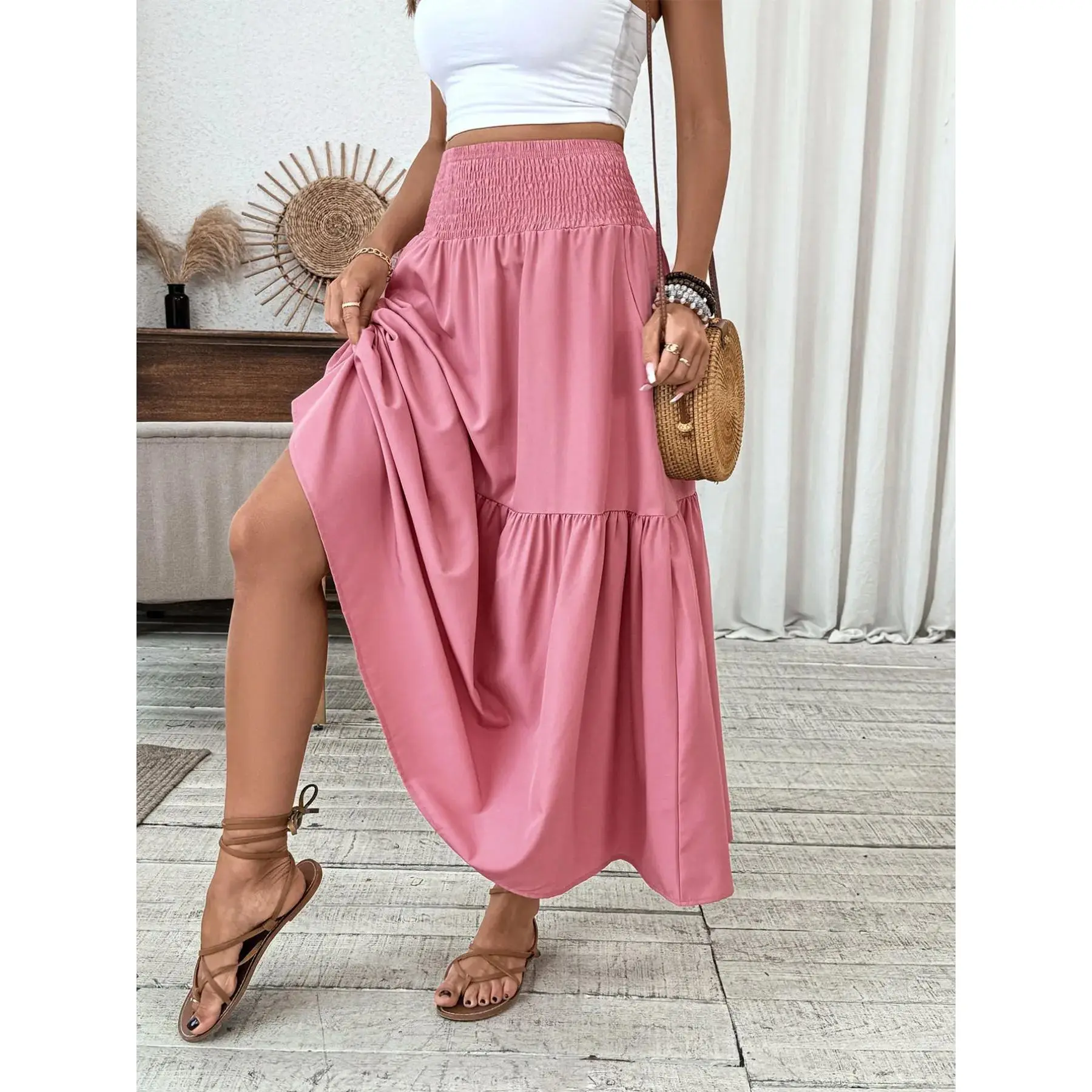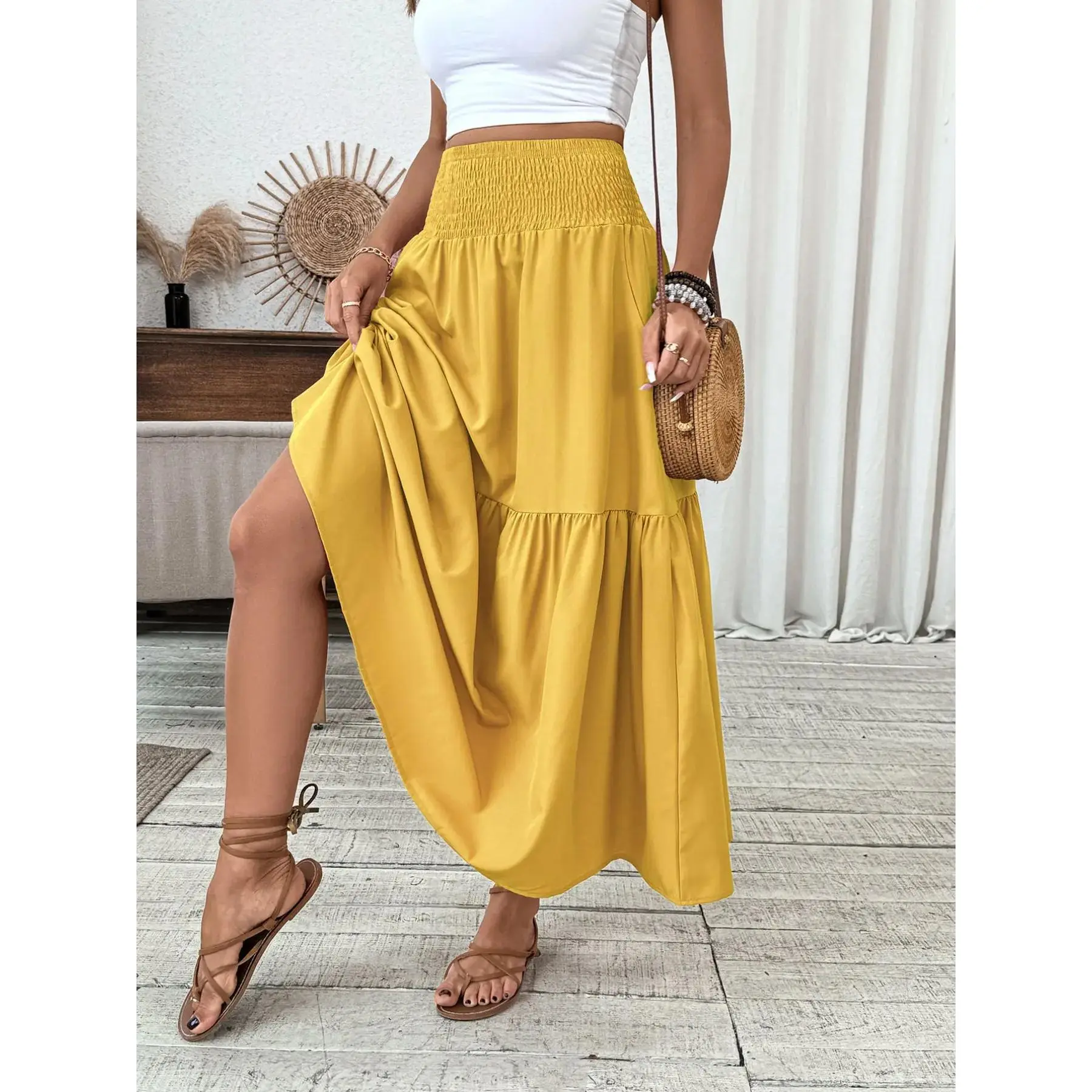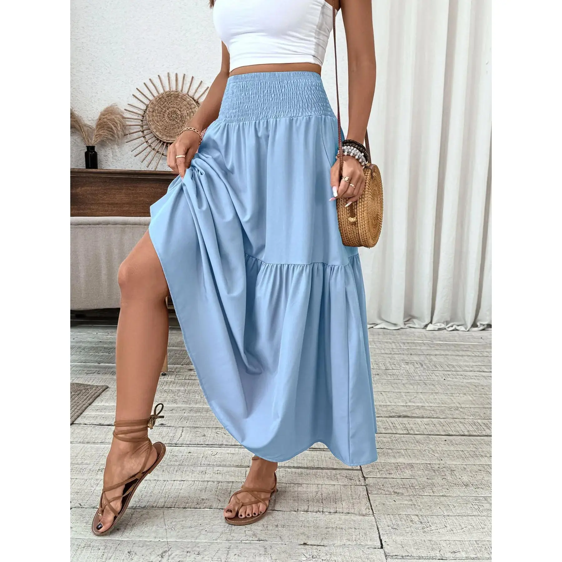 [Ruffled Hem]: The skirt's ruffled hem adds a playful detail, contributing to a feminine and chic visual appeal.