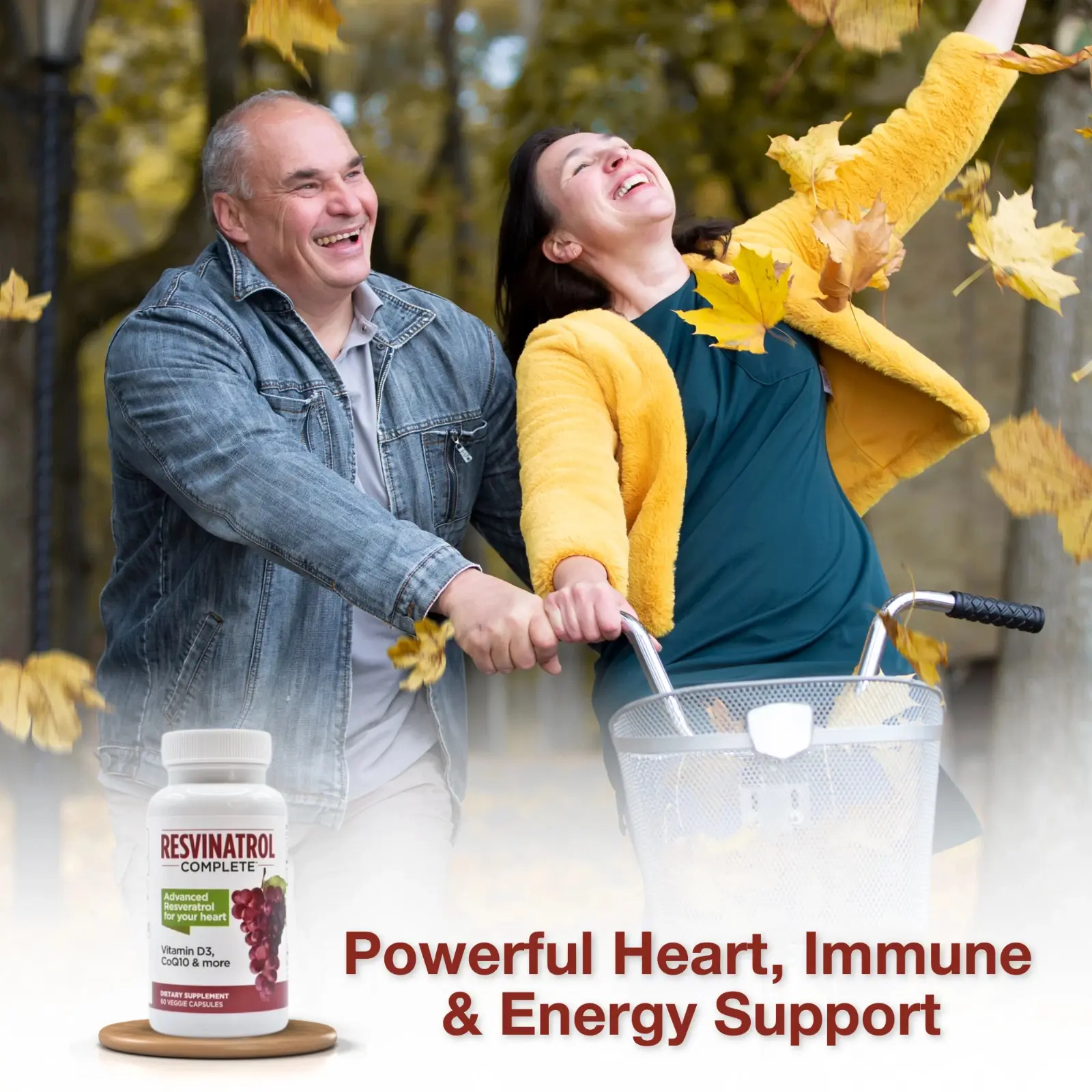 Resvinatrol Complete is a dietary supplement featuring resveratrol, CoQ10, and plant-based ingredients to support overall wellness and daily balance. Easy-to-take capsules fit seamlessly into your routine.