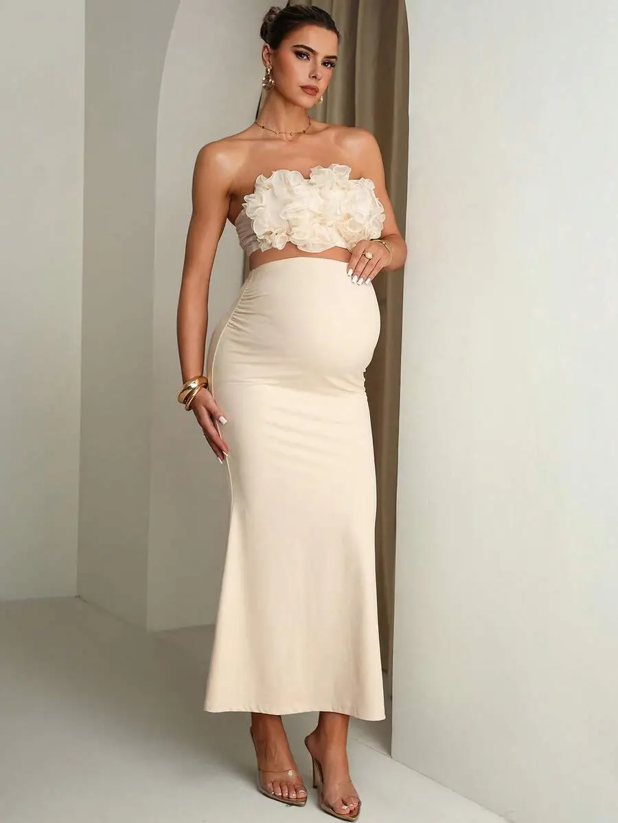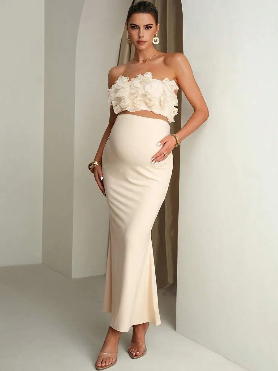 JOYCEE Maternity Solid Color Ruffle Trim Cropped Camisole Top And Adjustable Waist Mermaid Hem Skirt Elegant 2-Piece Set Summer Outfits Pregnancy Dress For Photoshoot Wedding Guest Dress