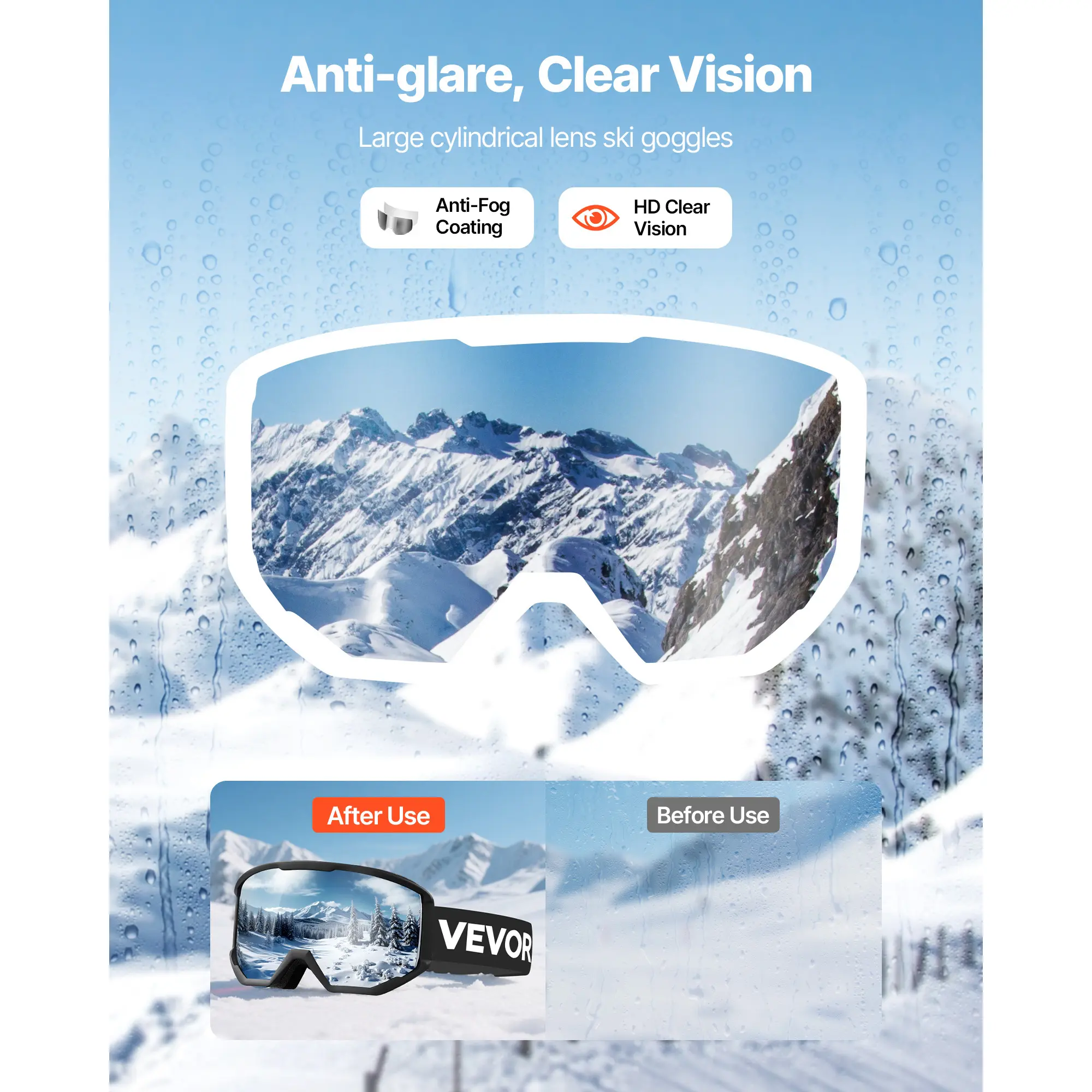 5. VEVOR Ski Goggles, Cylindrical Lens with Silver Mirror Revo Coating, OTG Anti fog Snow Goggles for Men Women Youth, TPU Frame & Ventilation Structure, Suitable for Skiing, Skating, Snowboarding, Cycling