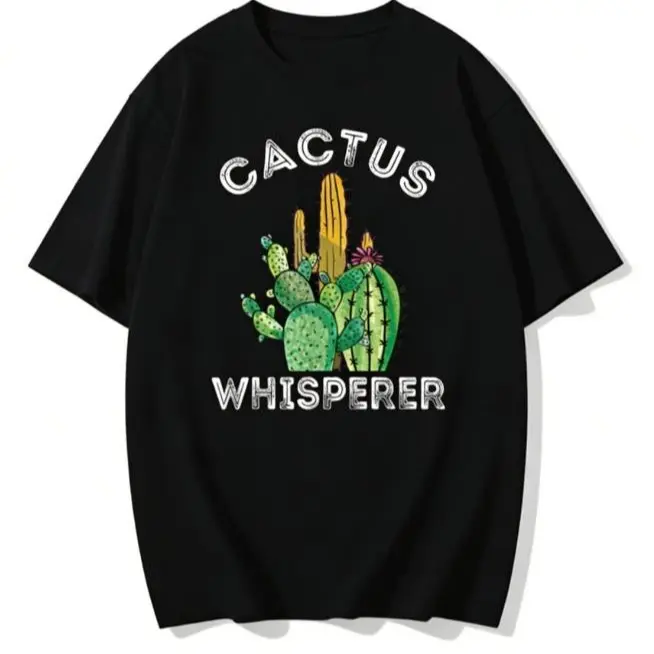 This unisex graphic tee is ideal for plant enthusiasts. It features a fun "Cactus Whisperer" design, perfect for those who love quirky, plant-themed apparel. The 100% cotton material ensures comfort and breathability, making it a great choice for everyday wear.