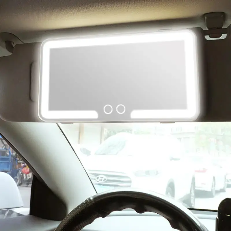 Elevate your car's interior with this stylish LED makeup mirror. Perfect for on-the-go touch-ups, it features a dimmable touchscreen for easy use. Choose from 3 color light modes to suit your needs. This boujee accessory clips onto your sun visor, offering a foldable design for convenience. Ideal as a gift for her, it combines functionality with elegance.