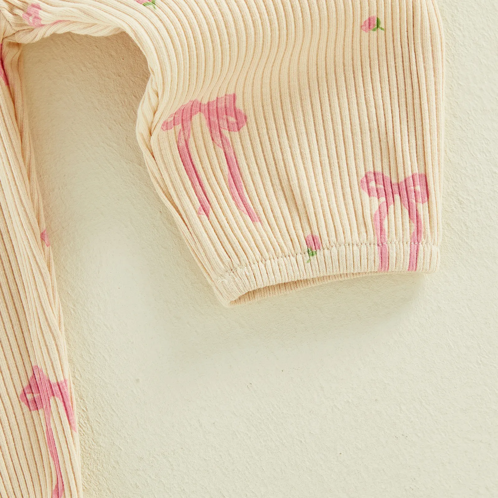 Preemie Newborn Baby Girl Outfit Bow Ribbed Short Sleeve Romper Pants and Headband 3 Piece Summer Set