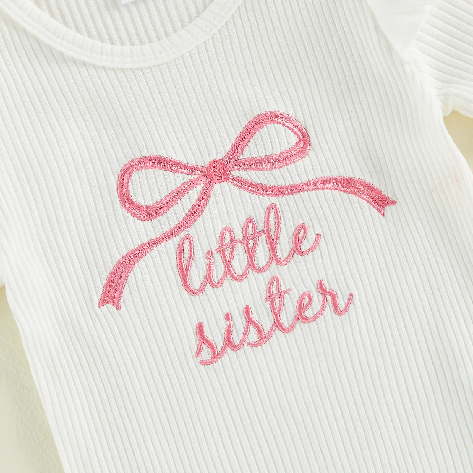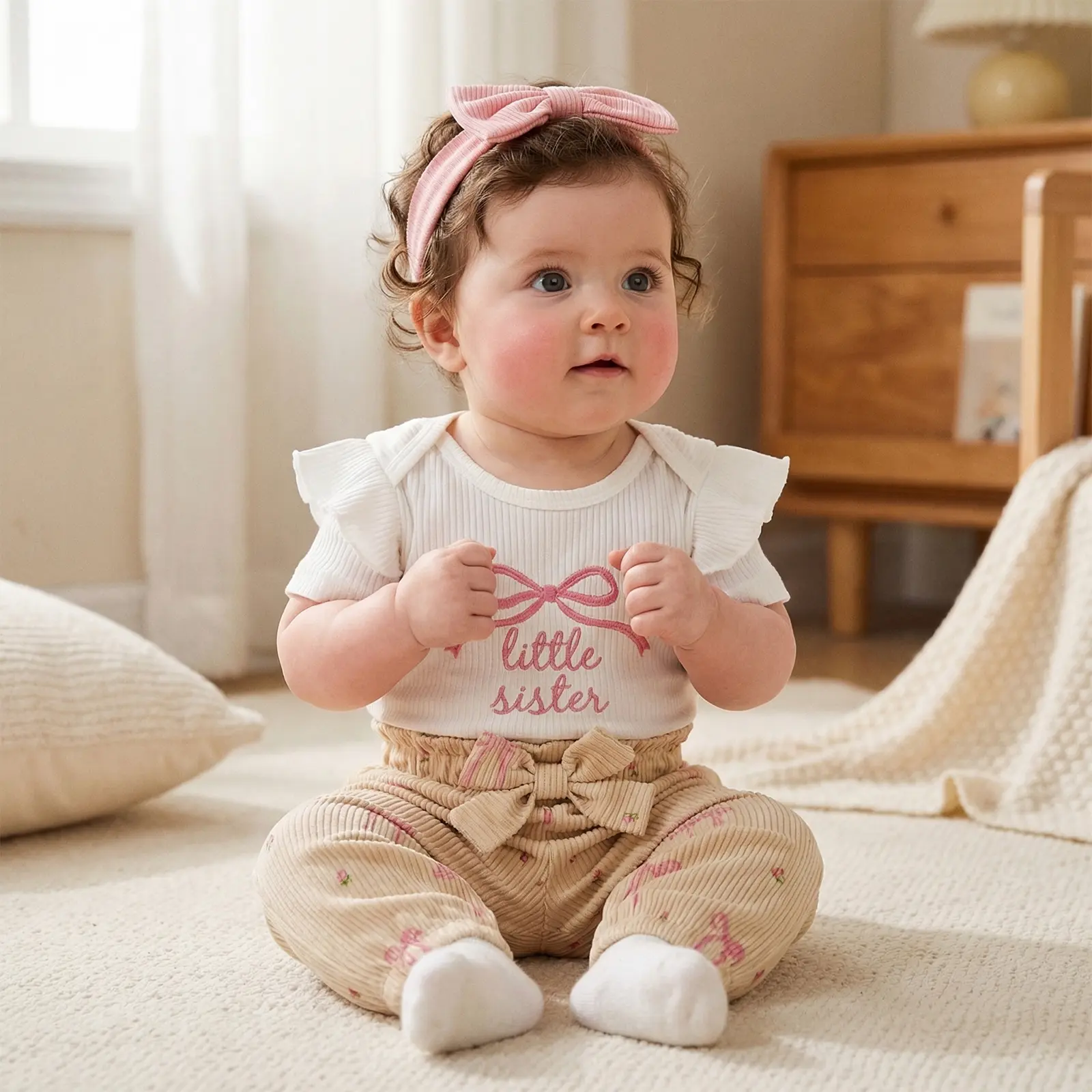 ·DESIGN:Adorable baby girl 3-piece set: boutique short sleece sleeve frill onesie with “little sister” letter and sweet bow embroideredribbed knitted romper, ruffle fly sleeve, boho vintage bow floral ruffle bloomer knit pants + matching bowknot headband. Basic yet stylish design, retro boho vibes, makes your little one stand out in photos. Easy for diaper changes