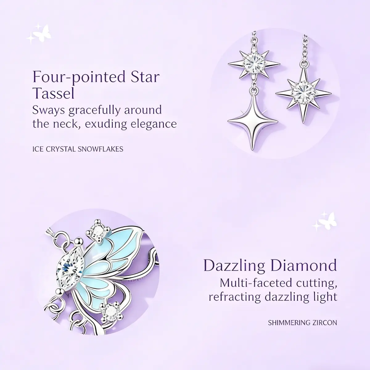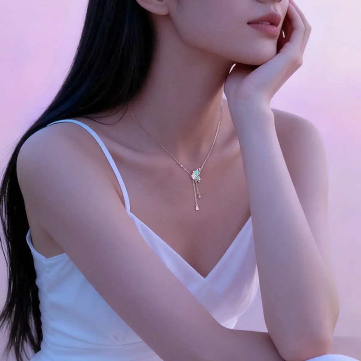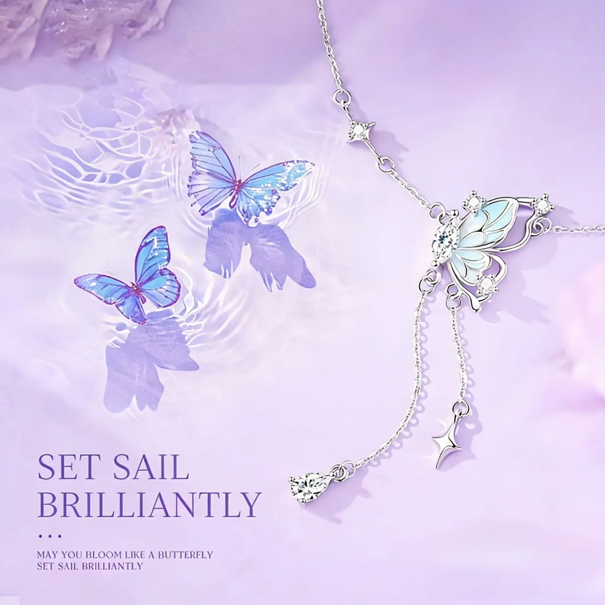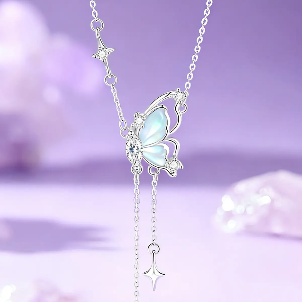 Every detail is thoughtfully executed: the luminous accents are set with precision to enhance the butterfly’s delicate form, while the two cascading tassel chains add dynamic movement. A star charm and teardrop luminous detail finish each tassel, and a subtle star accent on the main chain ties the celestial theme together seamlessly.