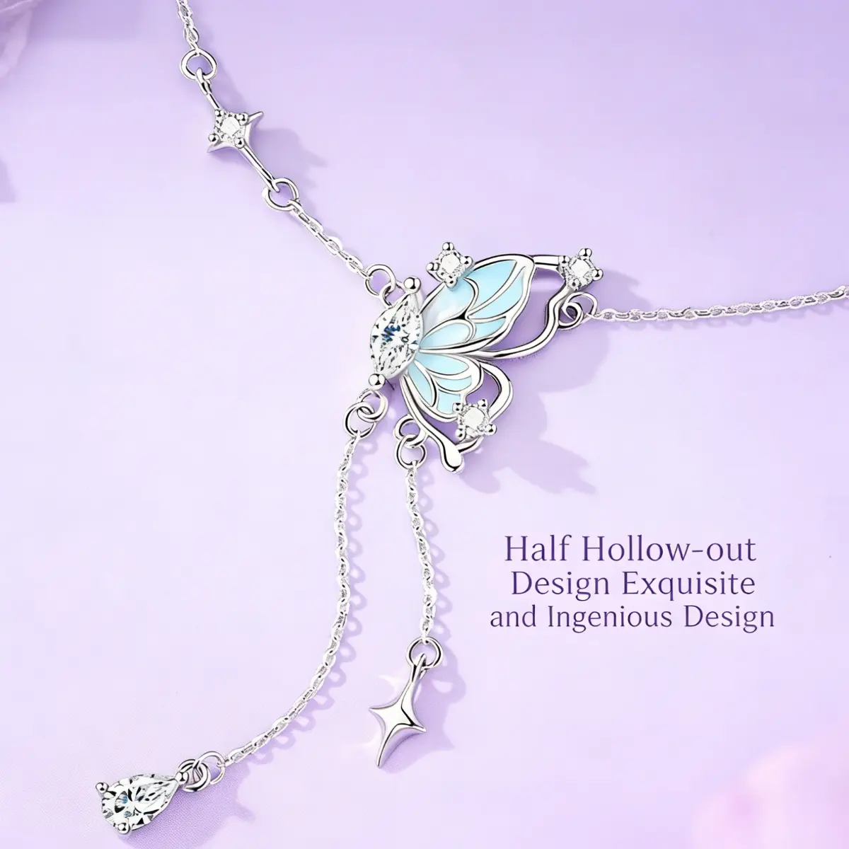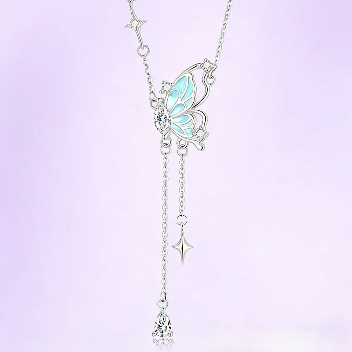 Experience the artistry of fine jewelry with this handcrafted open-work butterfly tassel necklace, a masterpiece of precision and design. The pendant features a meticulously crafted open-work butterfly silhouette, with clean, flowing lines that showcase expert craftsmanship. The wings are filled with a smooth, glossy blue enamel, creating a striking contrast against the polished silver-toned frame.