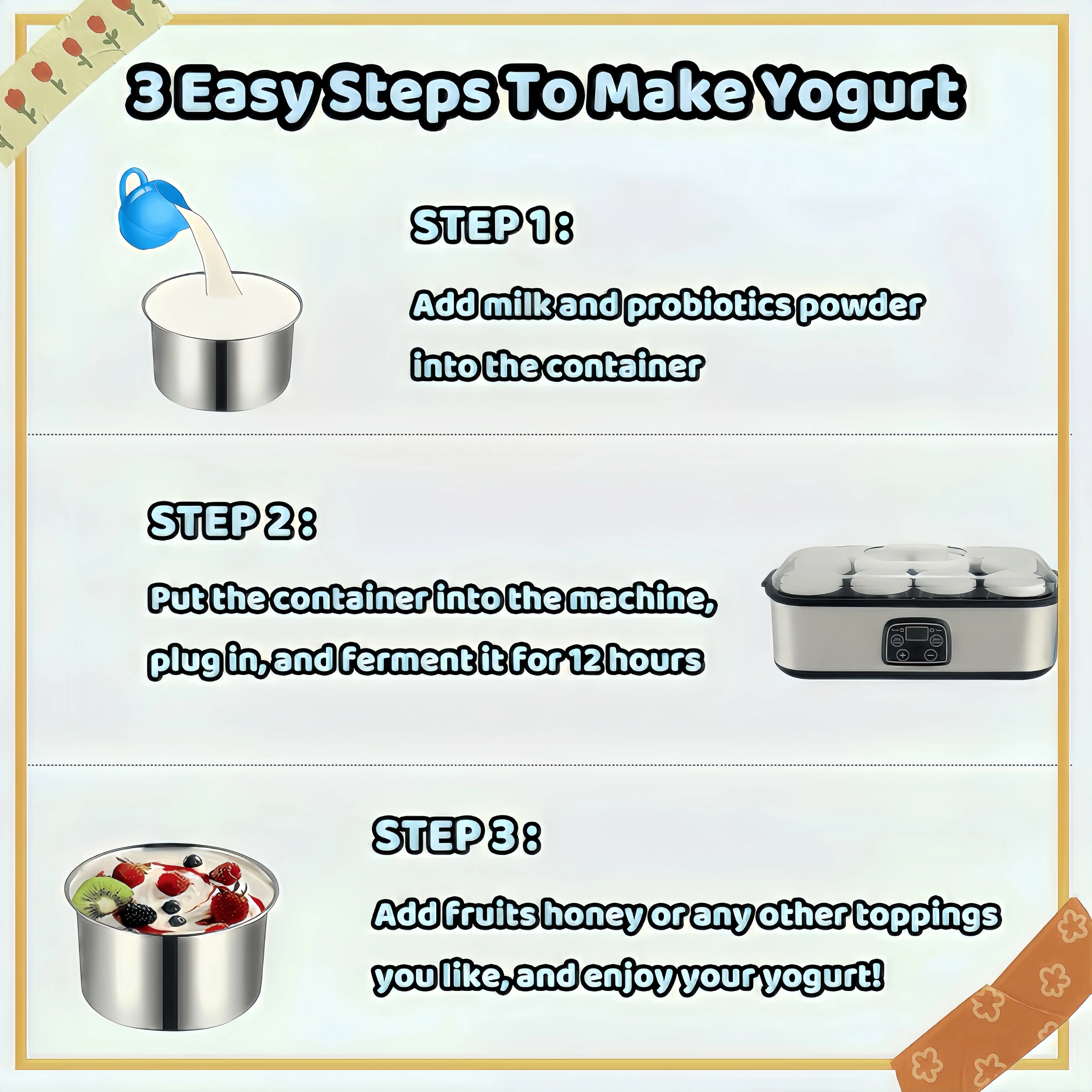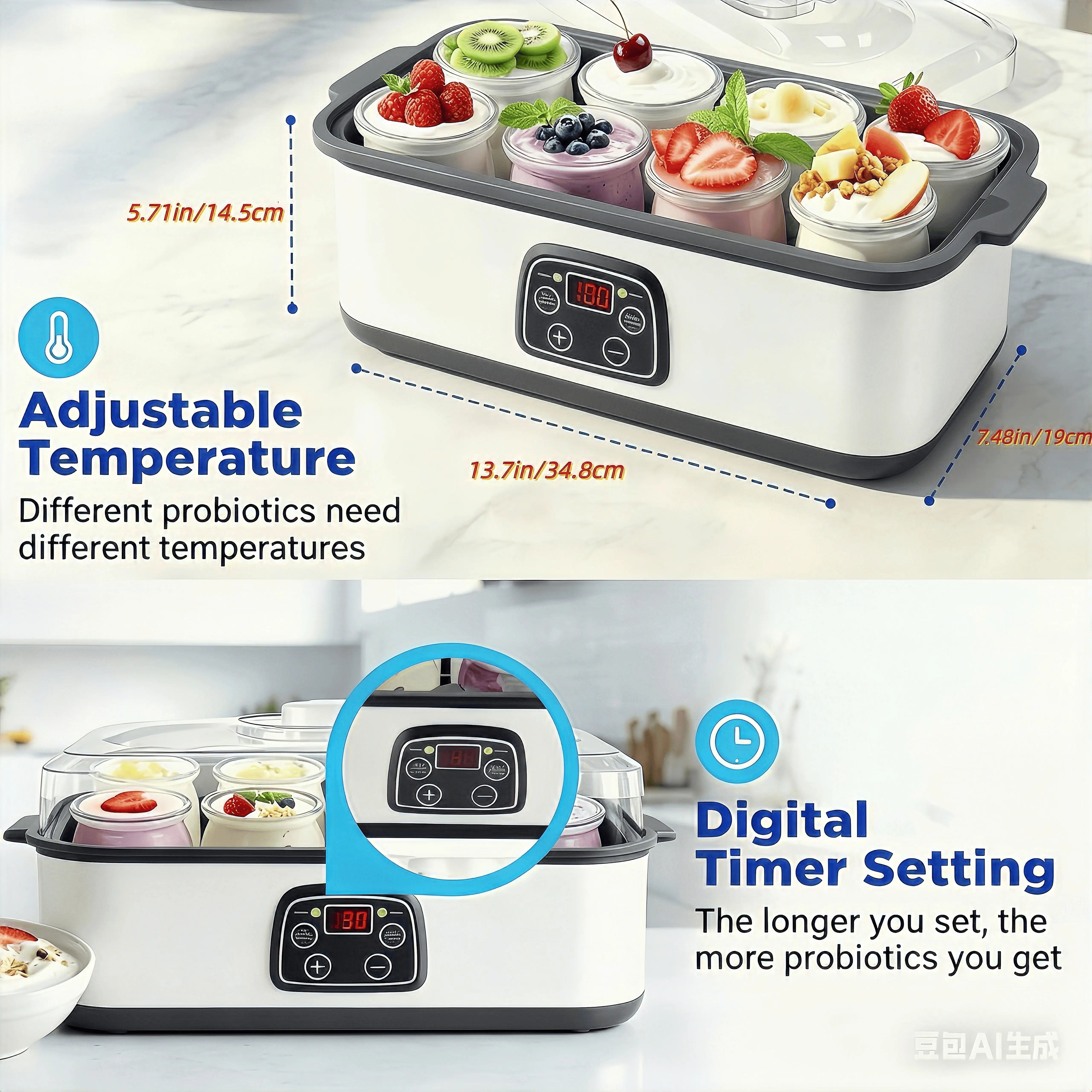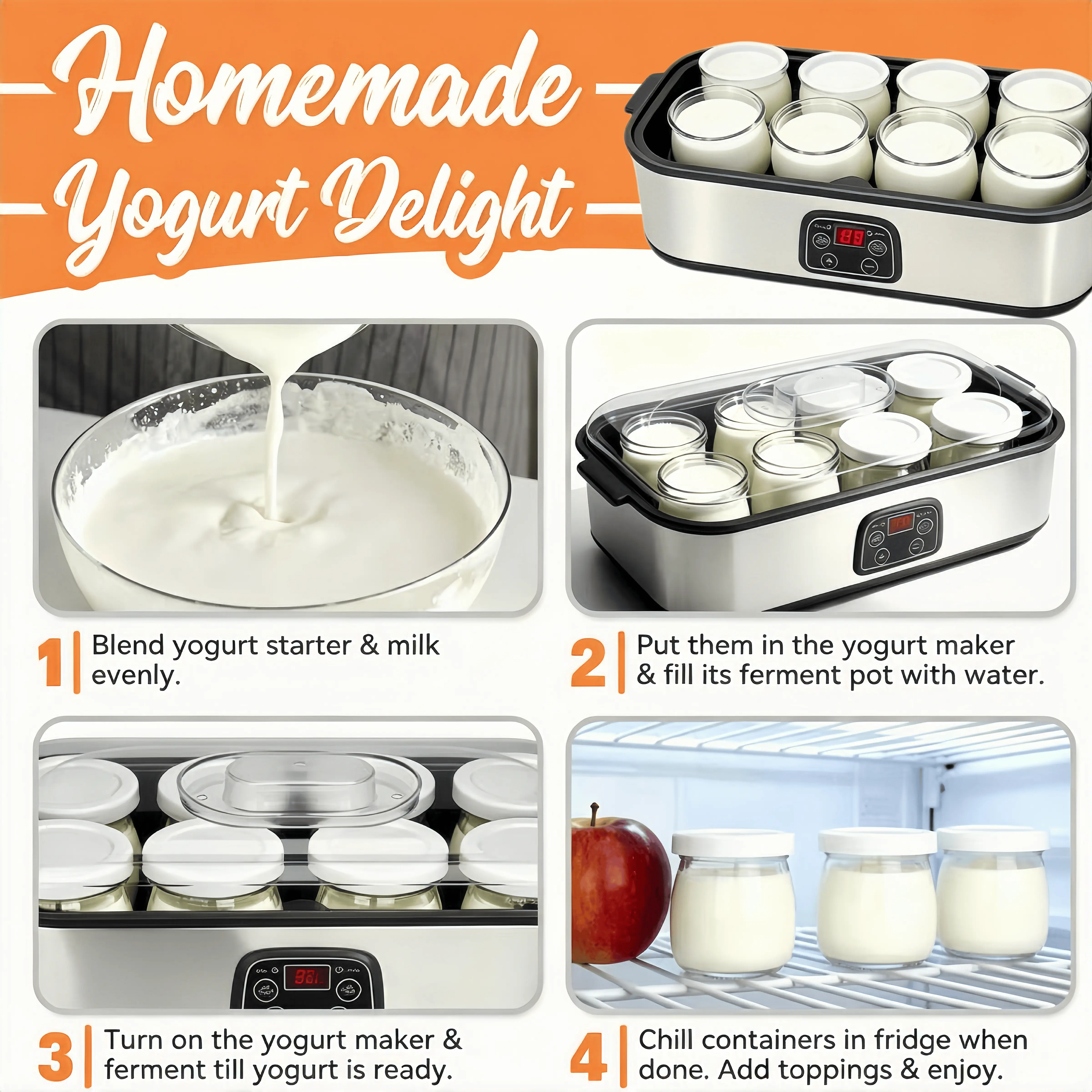 Electric Yogurt Maker with 8 Containers - Promote gut health with probiotic-rich homemade yogurt - For homemade, probiotic yogurt, BPA-free 8 glass jars (60 oz), adjustable time and temperature control, auto shut-off and constant temperature