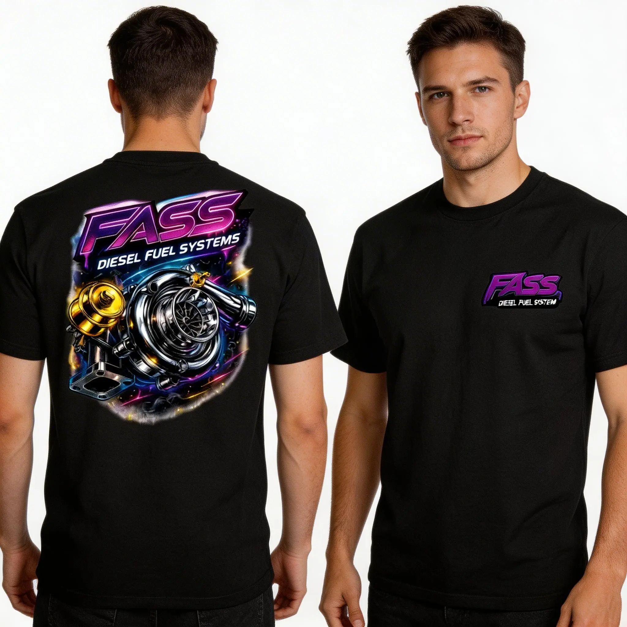 FASS Diesel Fuel Systems Chrome Turbocharger Graphic T-Shirt Neon Racing Performance Tee for Car Enthusiasts Streetwear Turbo Boost Outfit Men's and women's tops suitable for everyday wear and all seasons