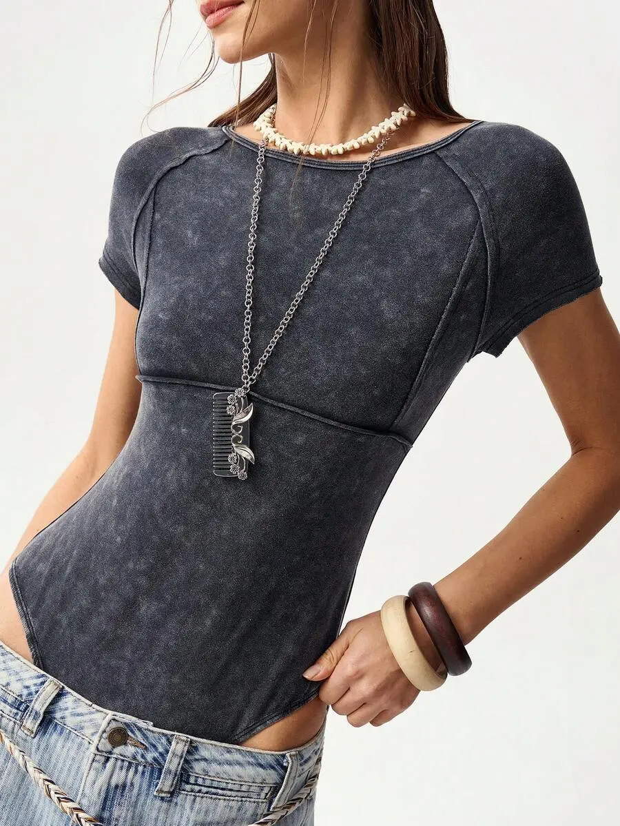 Bohemela Women's Summer Casual And Comfortable, Ideal For Streetwear Vacations, And Western Music Festivals. A Bohemian Solid-Color Knit Bodysuit Featuring A Vintage Washed Distressed Finish, An Open-Back Detail, And A Comfortable Crew-Neck Cut