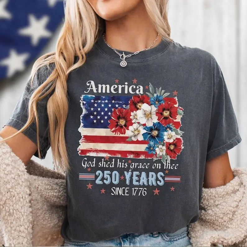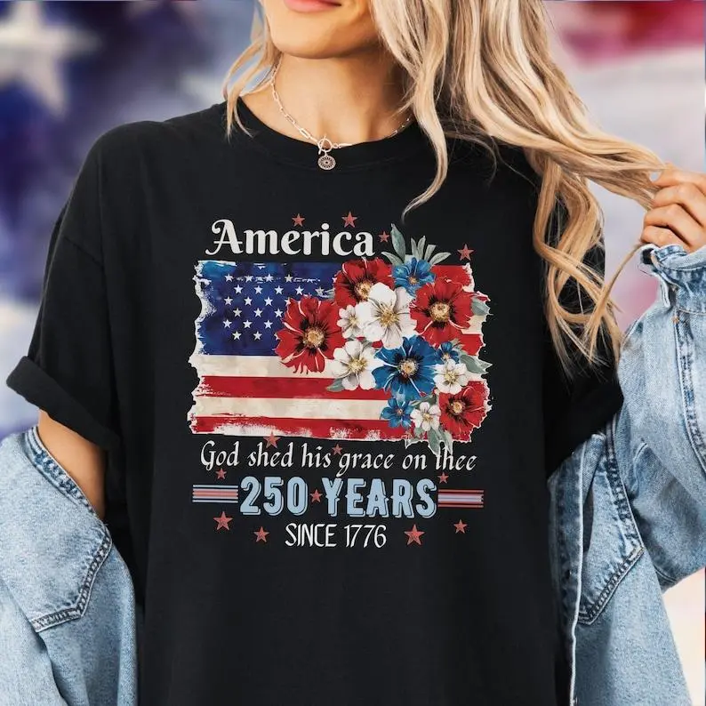 America 250 Years Flag Floral Graphic tshirt, Celebrate 250th Anniversary Patriot Gifted Shirt-4th of July Patriotism Gift USA-Cottagecore