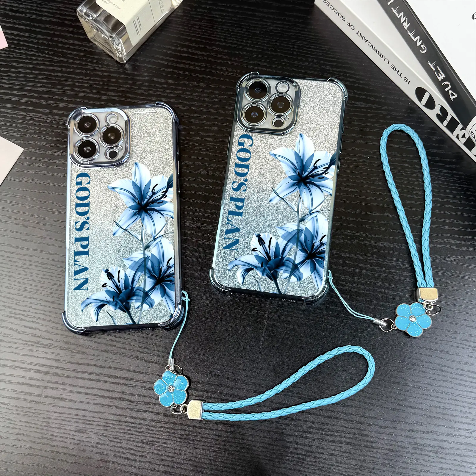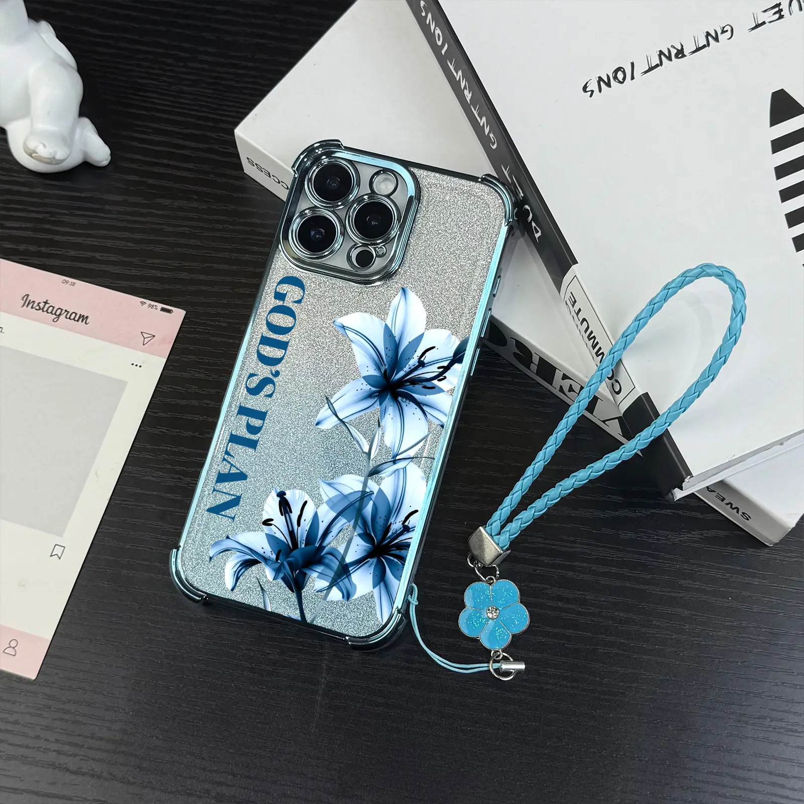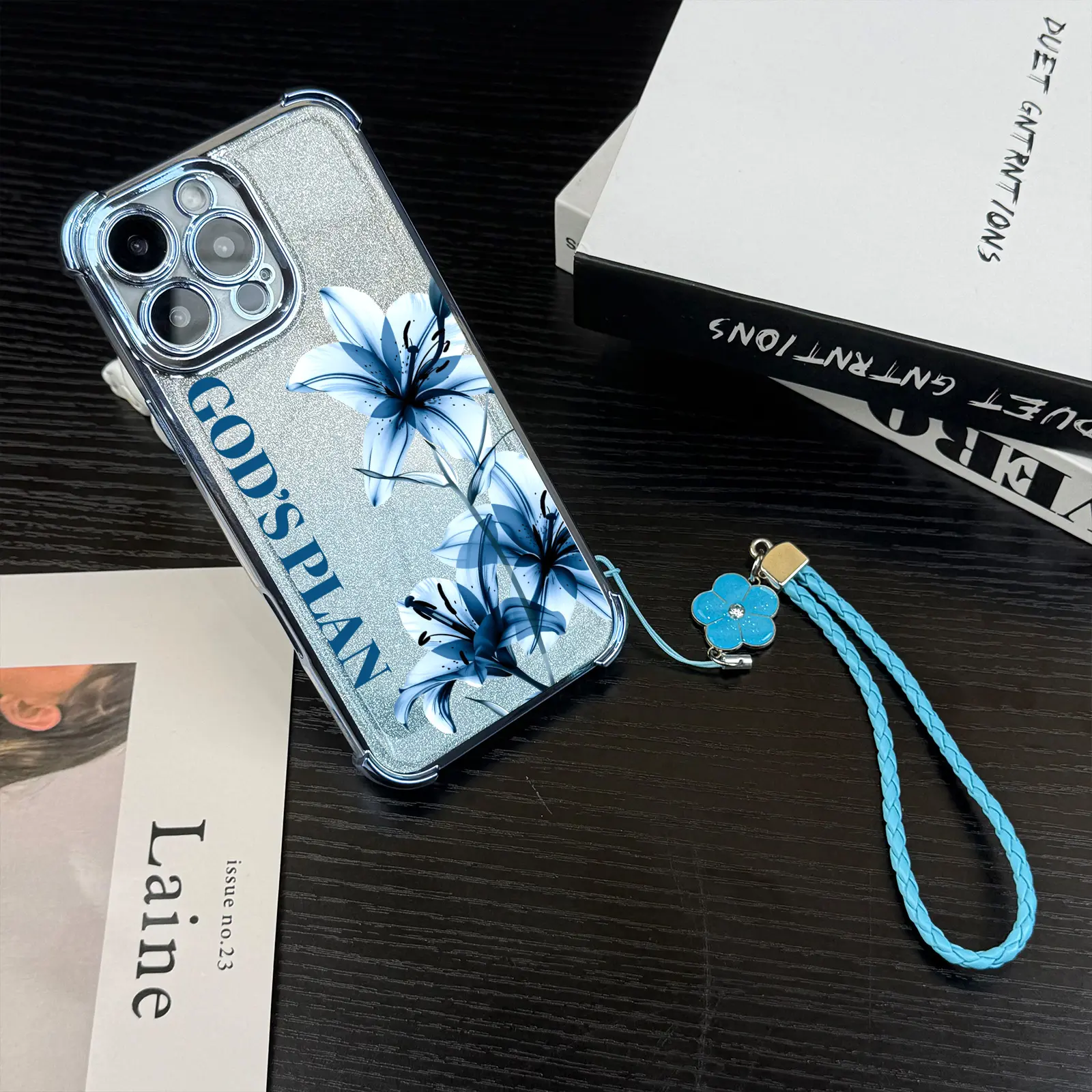Elegant Blue Floral God's Plan Case For iPhone Samsung Galaxy 17Pro Max Air 16 15Plus 14 13 12 11 XR XS S25 S24 S23 S22 Sparkly Glitter Inlay Electroplated Corner Protection With Portable Strap Accessory NN124