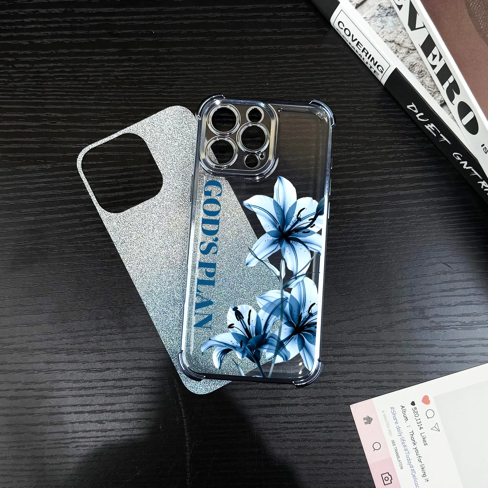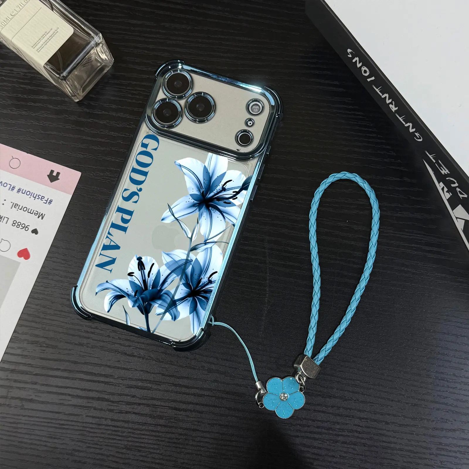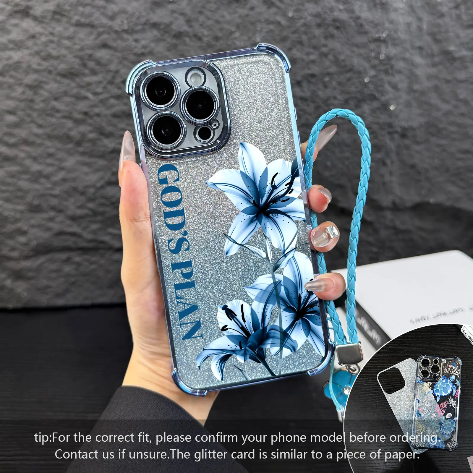 Elegant Blue Floral God's Plan Case For iPhone Samsung Galaxy 17Pro Max Air 16 15Plus 14 13 12 11 XR XS S25 S24 S23 S22 Sparkly Glitter Inlay Electroplated Corner Protection With Portable Strap Accessory NN124