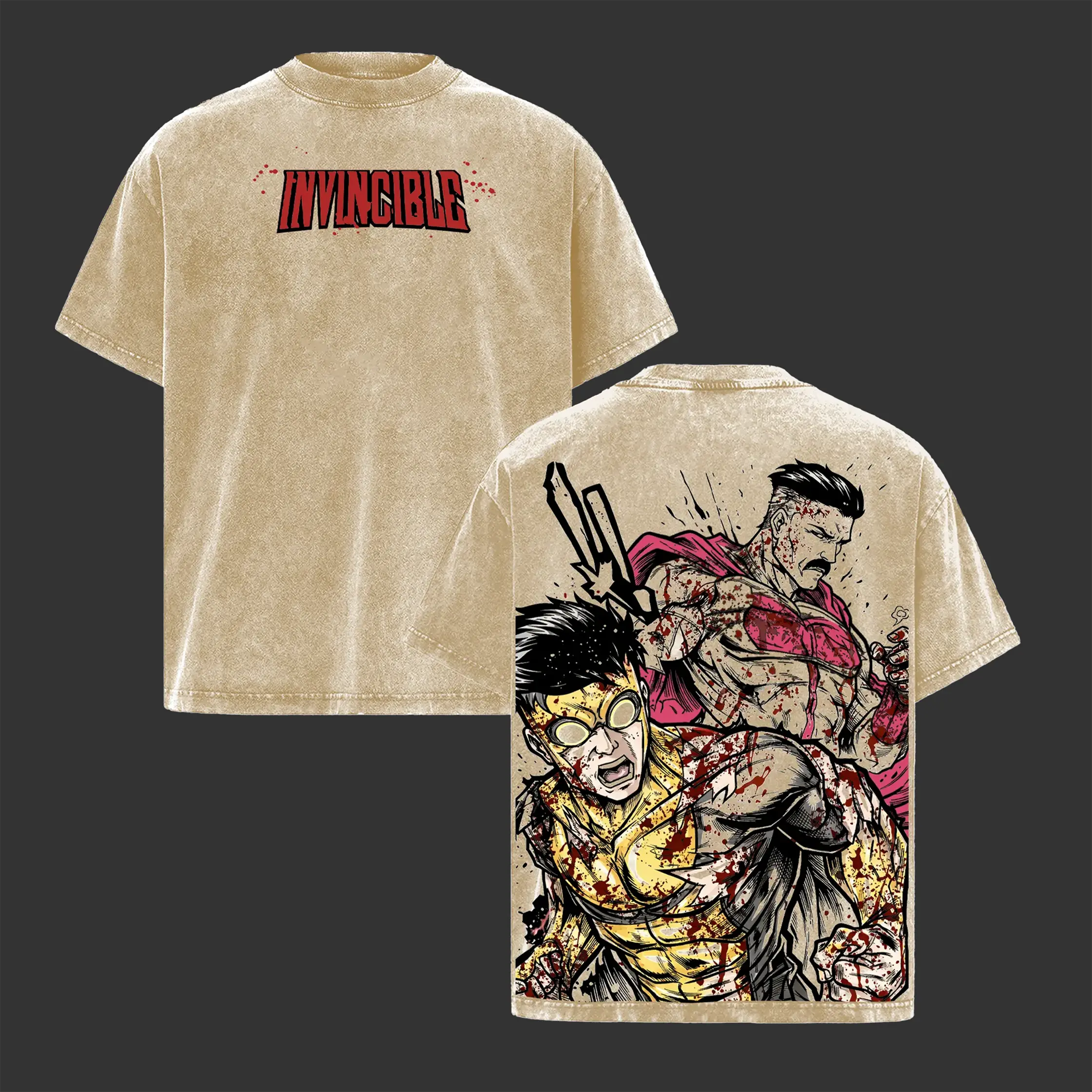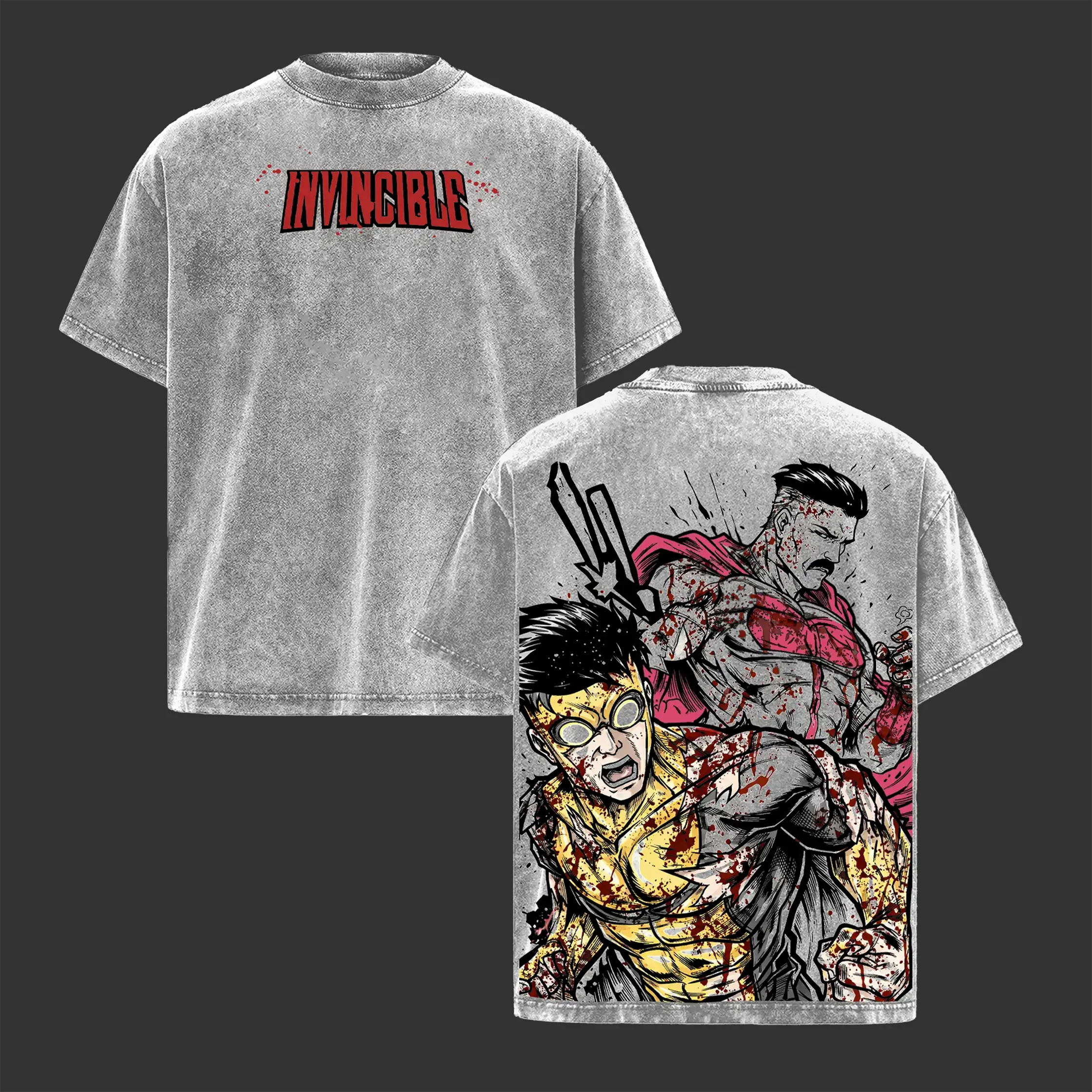 Invincible Omni Man Vs Mark Grayson Brutal Fight Game | Vintage Washed Graphic Tee | Oversized Heavyweight Game Shirt | Large Back Graphic Streetwear | High-Quality Cotton Fabric | Unisex | Game Merch | Gift For Gamers | Year-Round Casual Wear