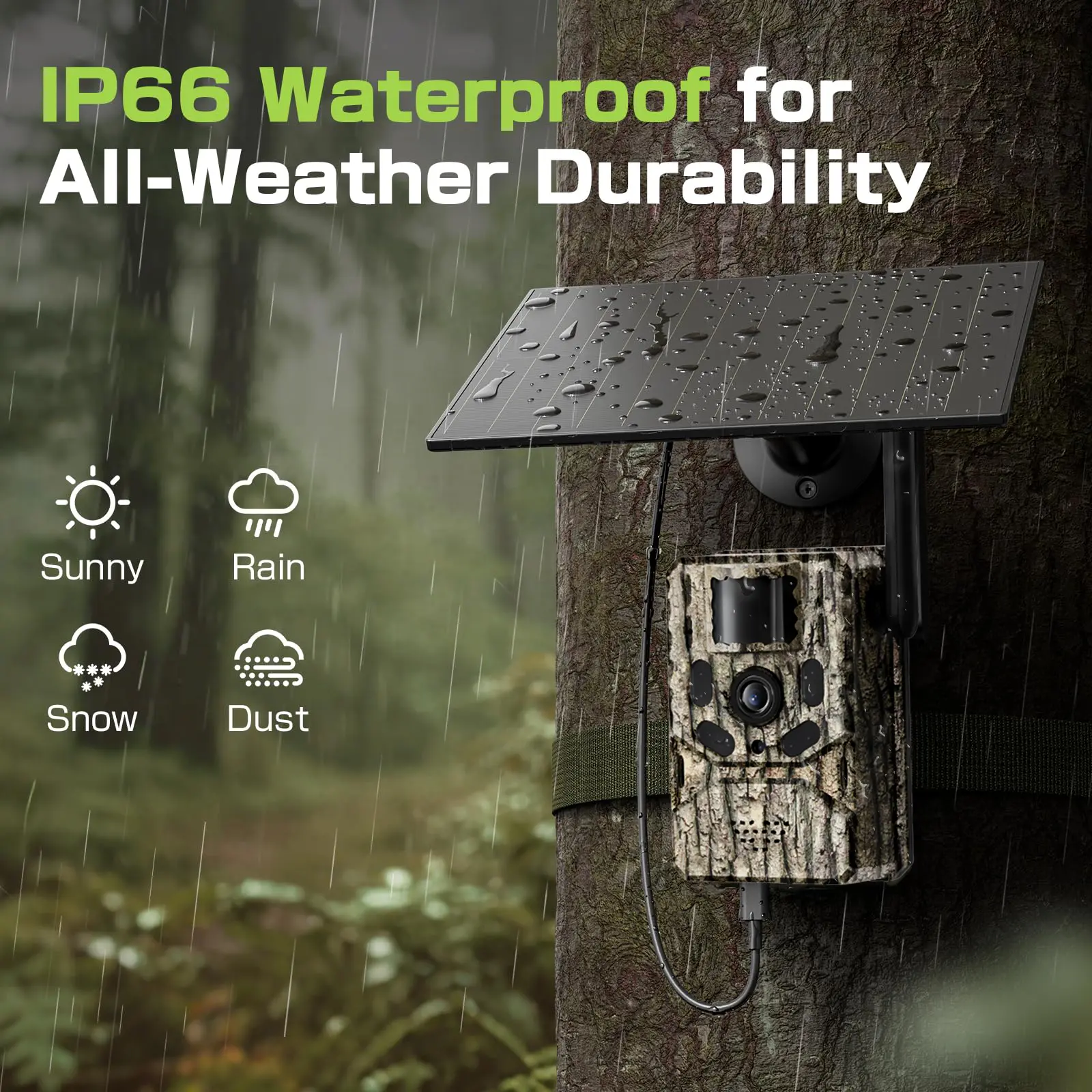 [No Need to Replace Battery Periodically] Equipped with a 4W solar panel and built-in battery, solar trail camera keeps providing electric power, no need to replace the battery periodically.This wireless trail camera is 100% wired-free and can transfer data without wifi.Plus robust body, ideal for forests, farms, ranches, jobsite, cabins, and other wild areas.