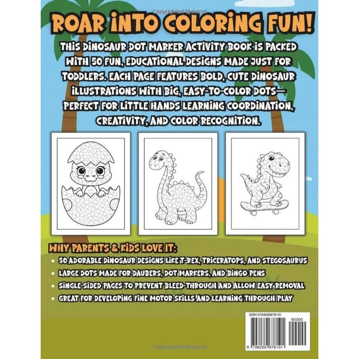This delightful dot marker book includes 50 bold and easy dinosaur designs, featuring favorites like T-Rex, Stegosaurus, Triceratops, and Velociraptor. Each page is crafted to help children develop fine motor skills, hand-eye coordination, and early learning — all while having tons of fun!