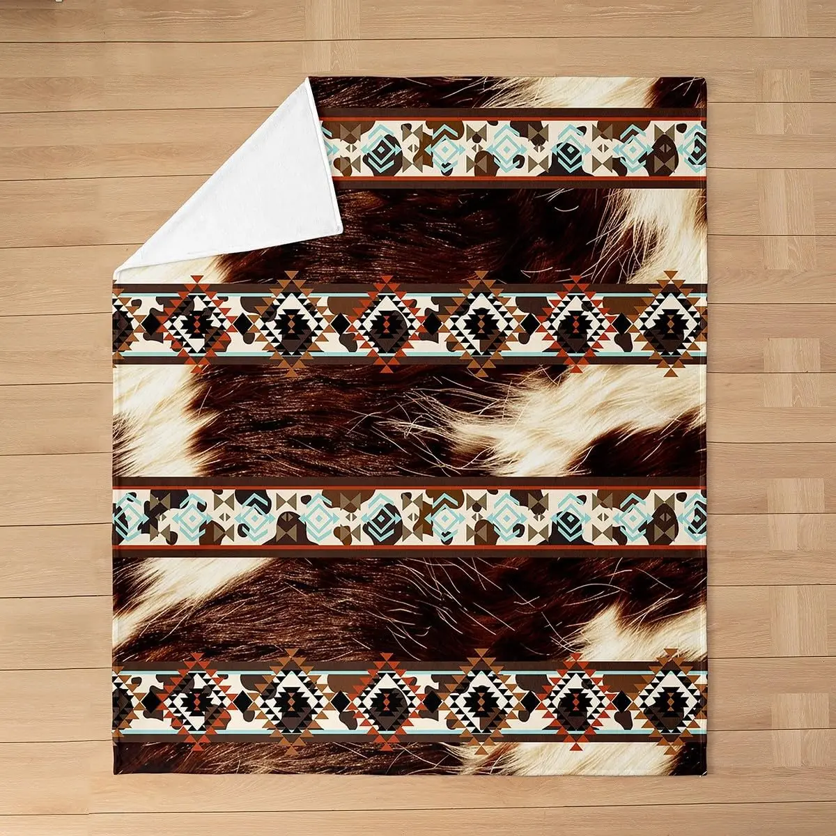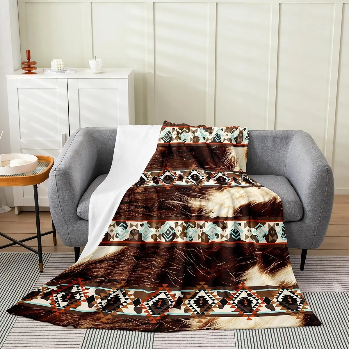 Western-style plush blanket, cowhide-pattern vintage flannel blanket, double size 60 inches x 80 inches, bohemian country farmhouse style, suitable for all seasons, exotic geometric pattern, suitable for sofa, bed, bedroom decoration, brown and beige: hom