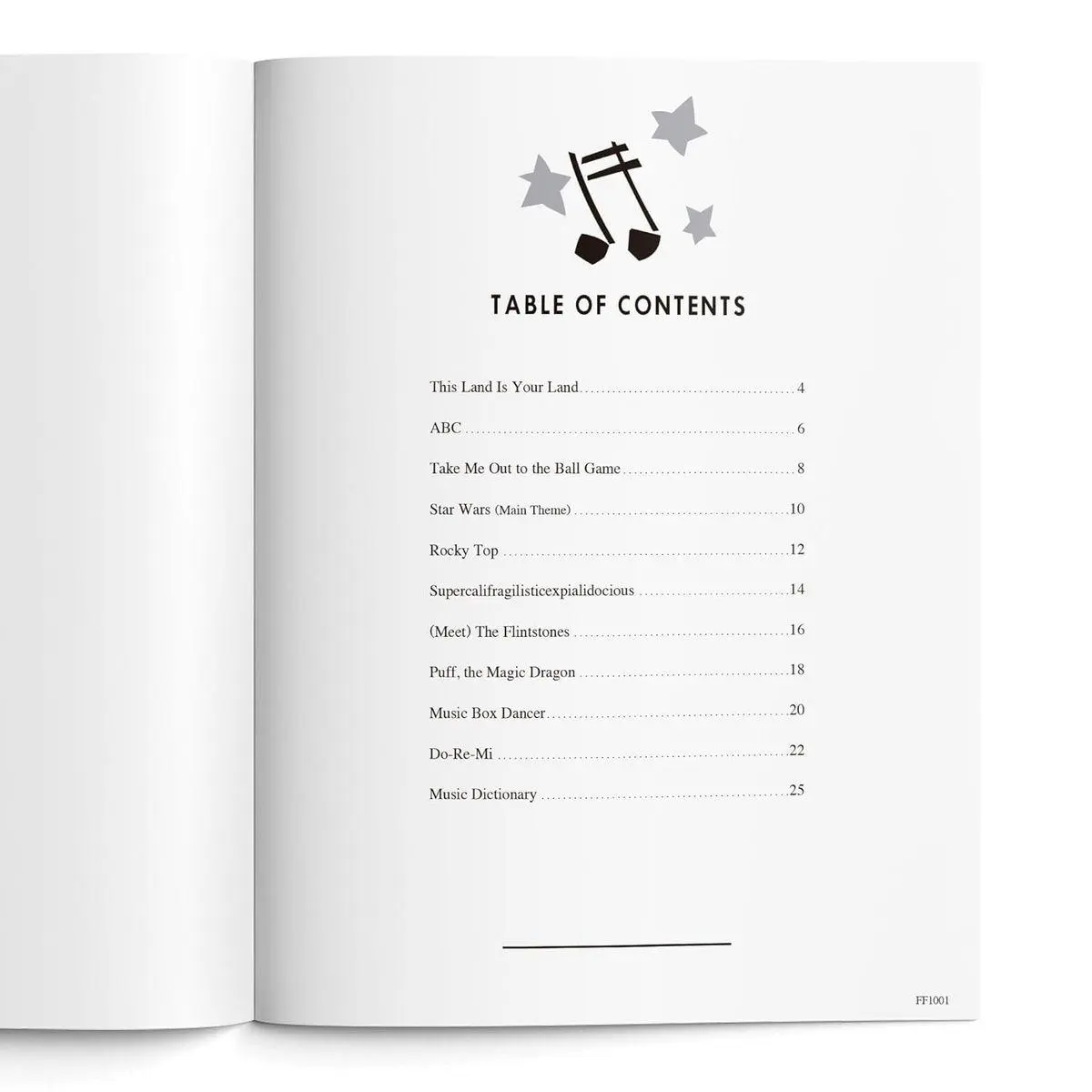 Full Song List: ABC * Do-Re-Mi * (Meet) The Flintstones * Music Box Dancer * Puff the Magic Dragon * Rocky Top * Star Wars (Main Theme) * Supercalifragilisticexpialidocious * Take Me Out to the Ball Game * This Land Is Your Land.