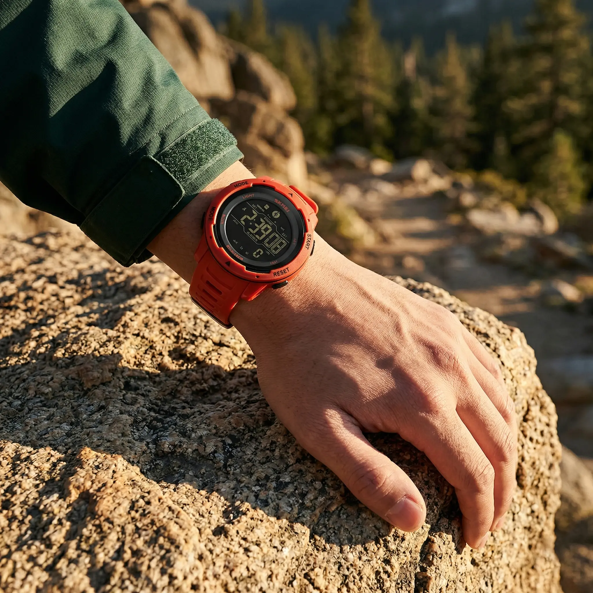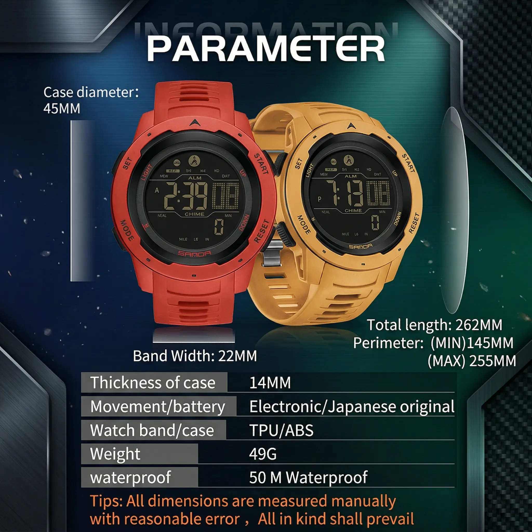 Digital Watch: The digital military watches equip with ABS case, TPU watch band and plexiglass mirror. The case diameter is 44mm/ 1.73in, case thickness: 15mm/ 0.59in. Enough strong for most outdoor activities.