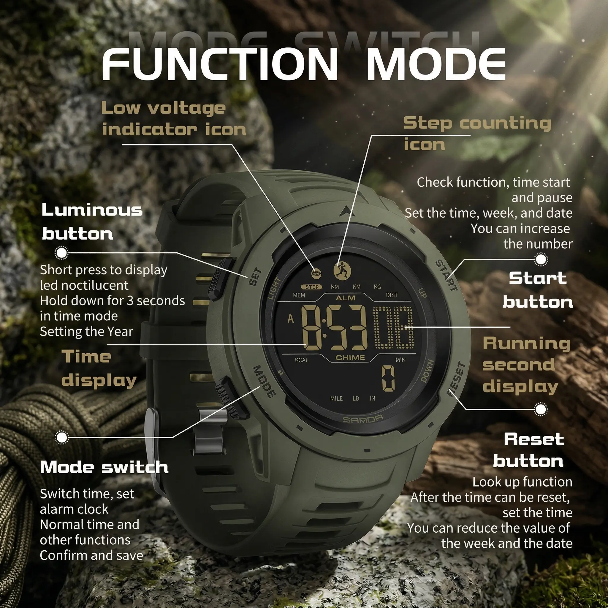 Sport Watch: The digital watch features alarm, stopwatch, countdown, EL backlight, 12/24 hour format, calendar and shockproof.