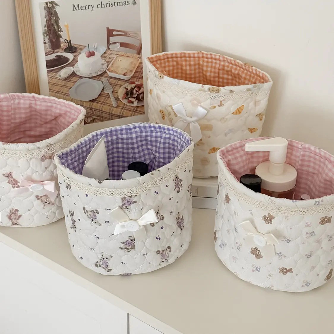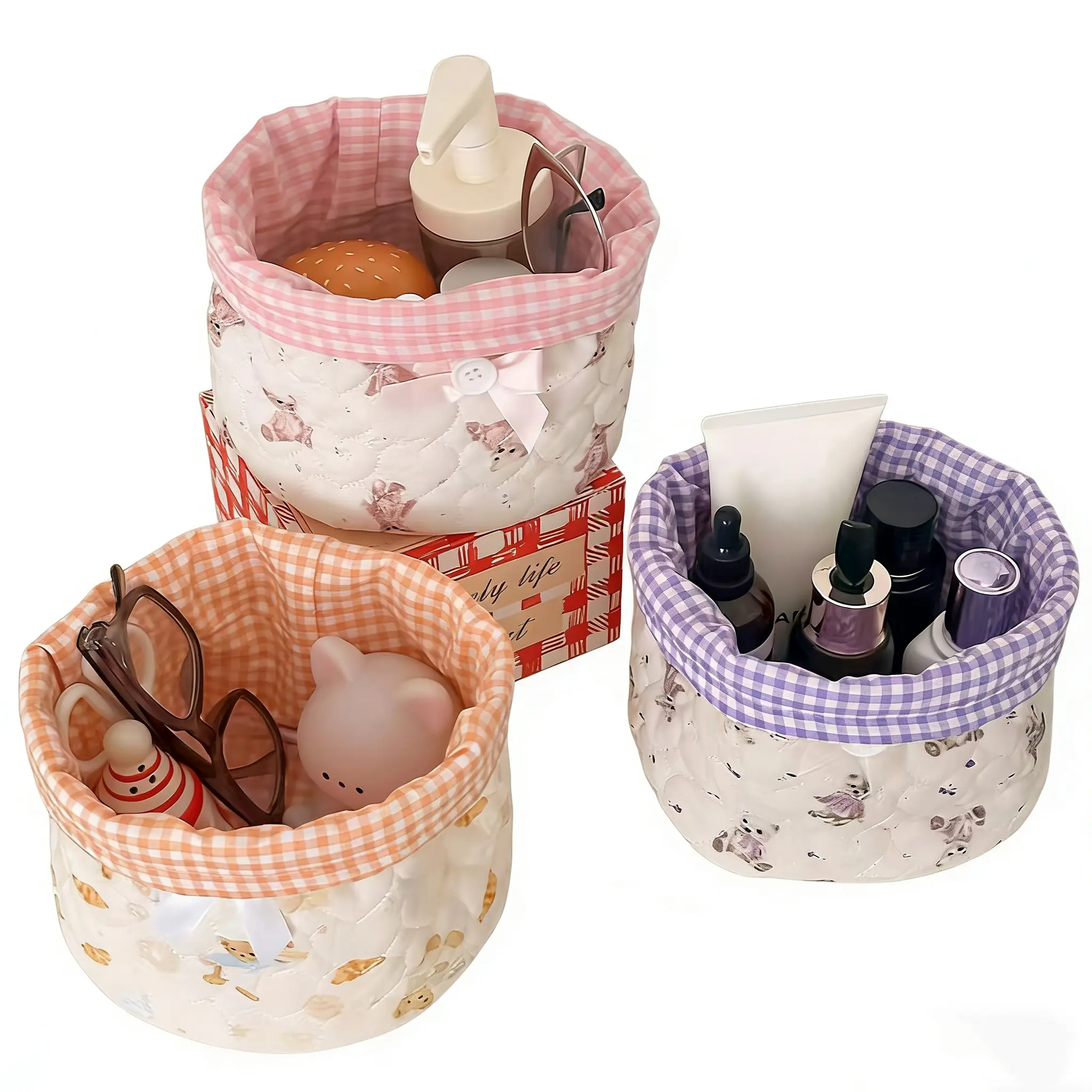 Cute Floral Quilted Fabric Storage Basket, Foldable Round Desktop Organizer for Makeup, Skincare, Sundries, Ins Style Plaid Lined Storage Bin for Home, Dorm, Bathroom