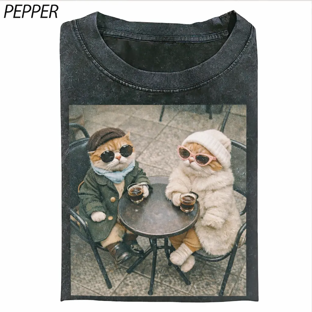 Cute Cat Couple Coffee Date Shirt, Aesthetic Vintage Kitty Tee, Cozy Cafe Cats Graphic T-Shirt, Soft Life Couple Outfit, Kawaii Animal Lover Shirt, Chill Vibes Streetwear Tee