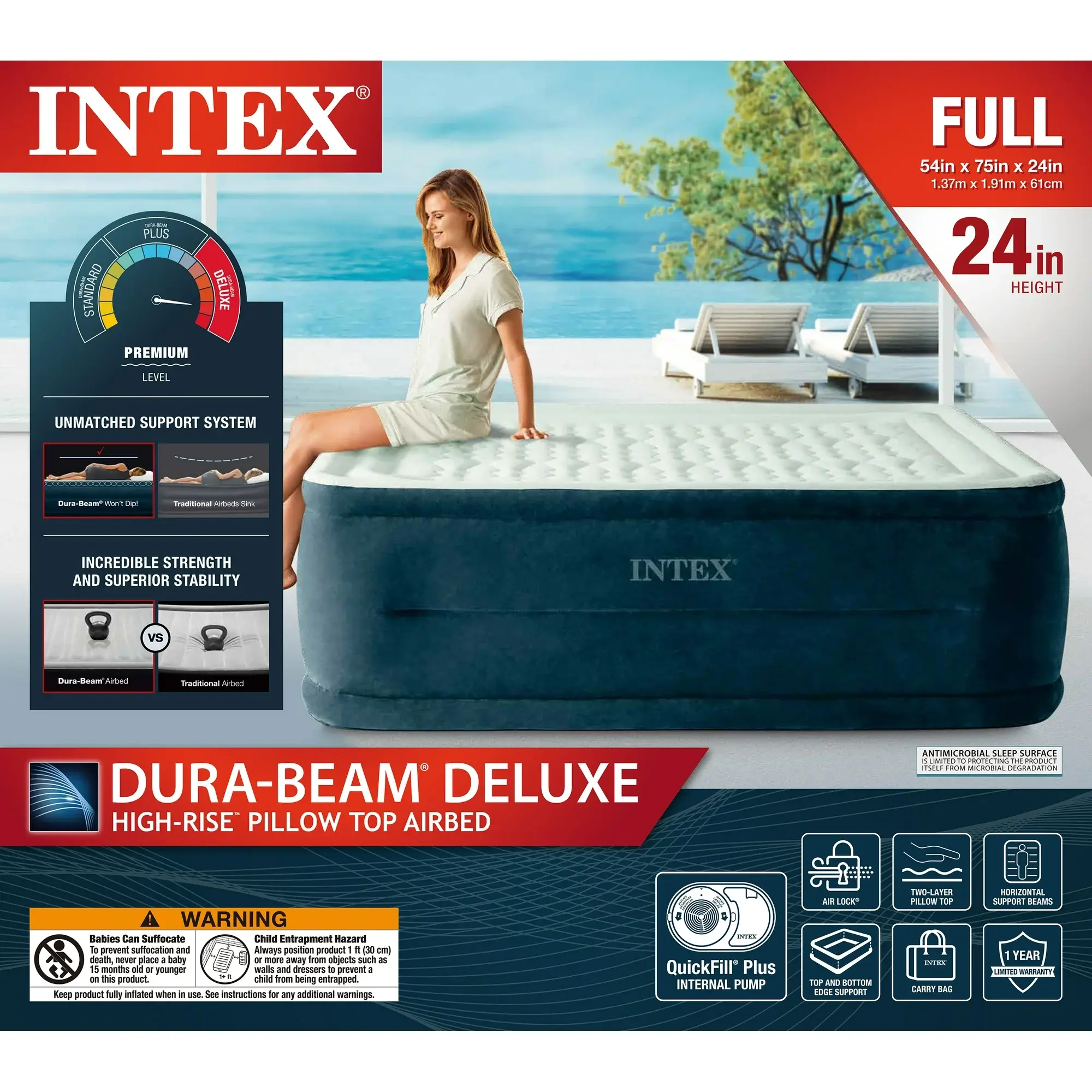 Ensure your guests enjoy restful sleep with the Intex 24" Full Dream Lux Pillow Top Dura-Beam Airbed Mattress. The mattress features a soft pillow top, robust beams for stability, and a textured exterior for comfort. Designed with enhanced internal fibers, it provides superior support. The built-in pump allows easy setup and deflation, while flocked sides help resist wear. Unique edge construction maximizes sleeping space and stability, ensuring a comfortable and supported sleep.