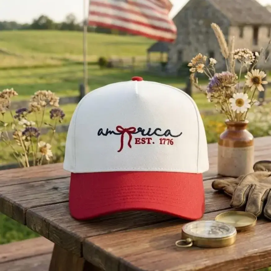 America EST. 1776 Embroidered Hat, Red White Baseball Cap, Patriotic Bow Gift