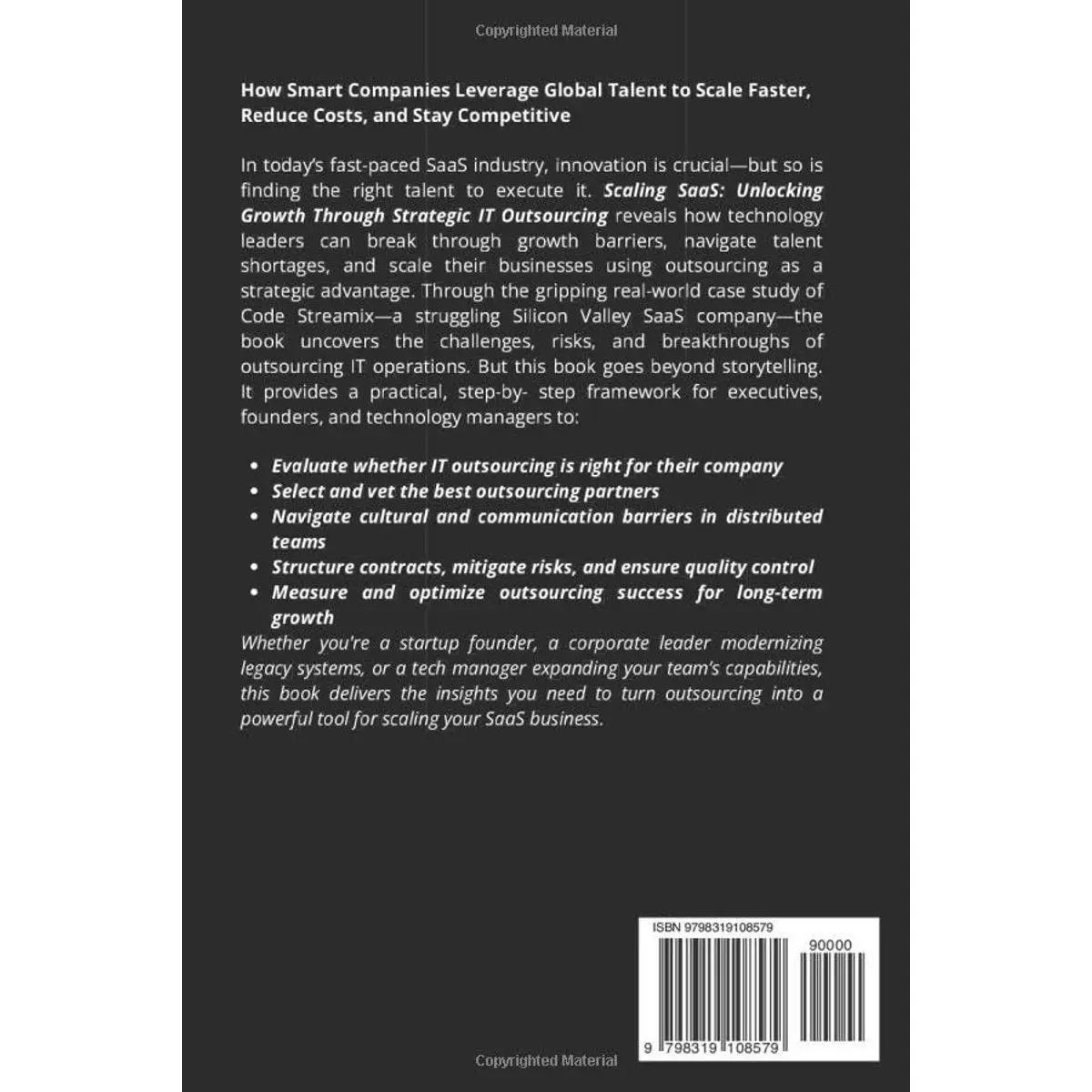 Whether you're a startup founder, a corporate leader modernizing legacy systems, or a tech manager expanding your team’s capabilities, this book delivers the insights you need to turn outsourcing into a powerful tool for scaling your SaaS business.