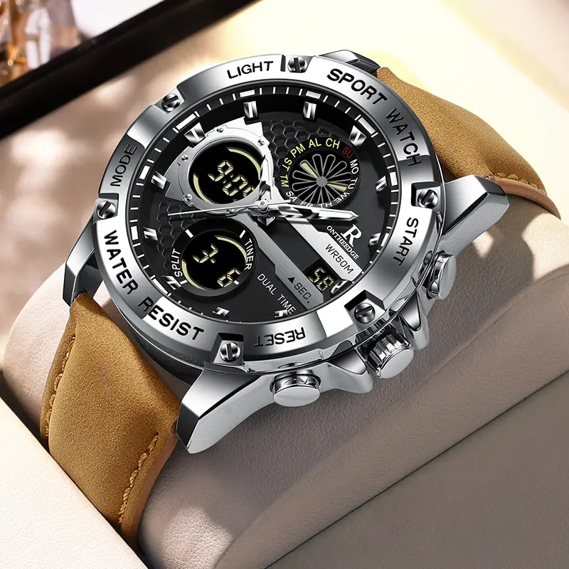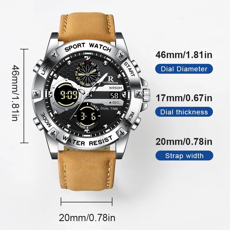 Men's Military Sport Digital Analog Quartz Watch - 50M Waterproof Wristwatch with LED Backlight, Dual Time, Alarm, Stopwatch, Tactical Outdoor Watch for Men, Brown Leather Strap, Perfect Gift for Him