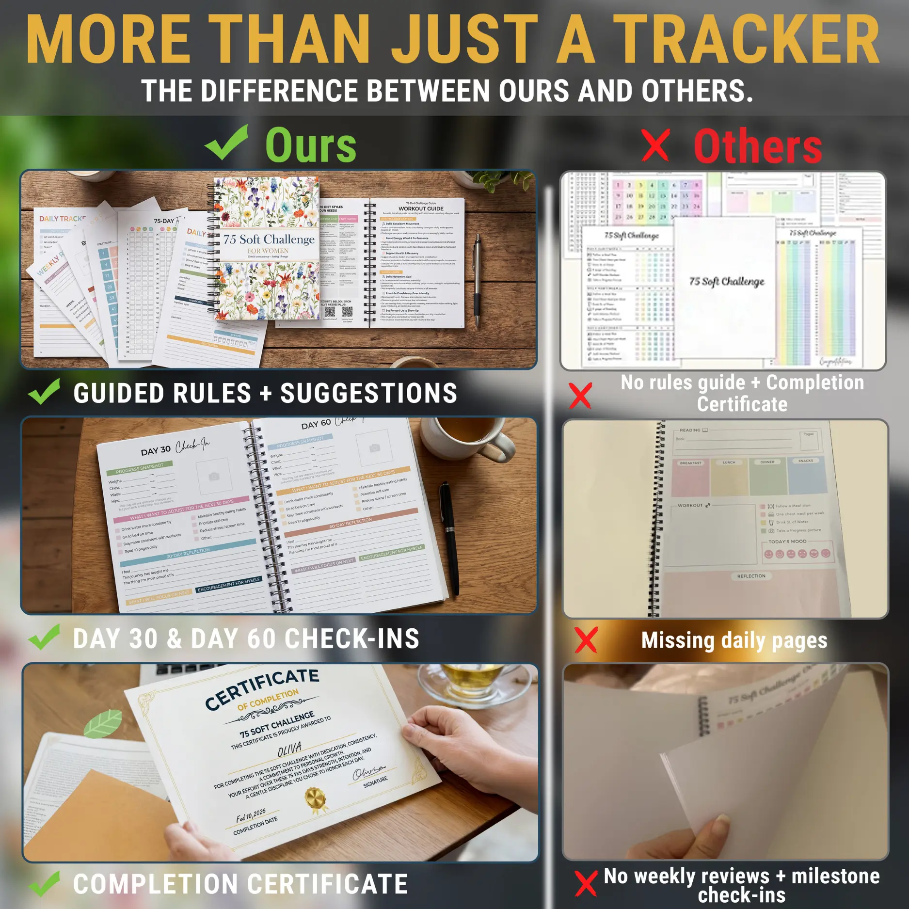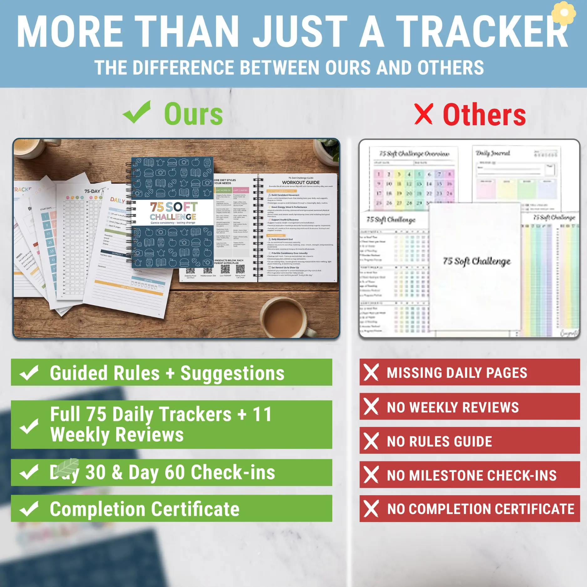 ·STAY CONSISTENT FOR 75 DAYS WITHOUT BURNOUT — Calming, gentle layout designed specifically for the 75 Soft Challenge for women; simple daily trackers keep routines clear, doable, and motivating—so you build sustainable habits and finish strong every time.