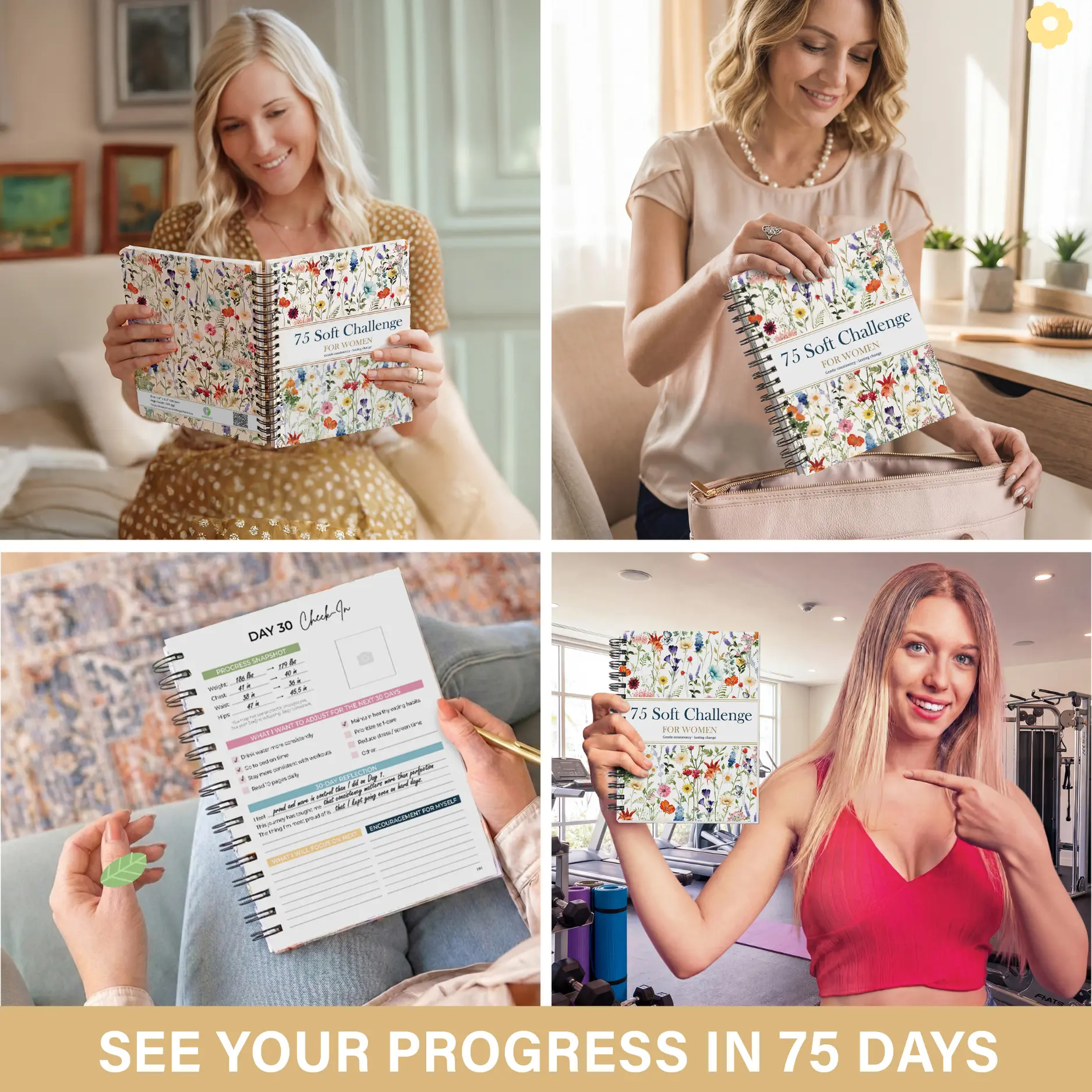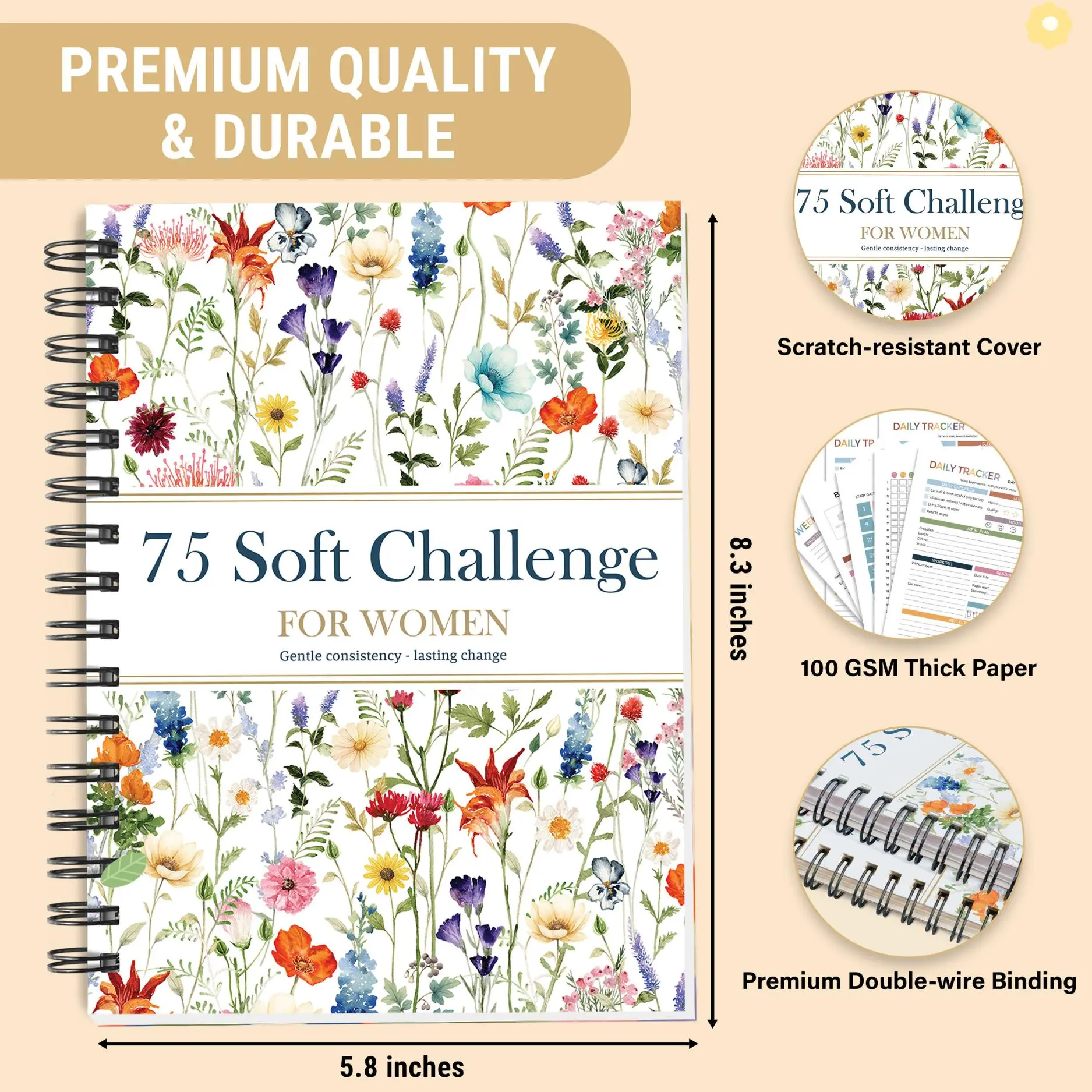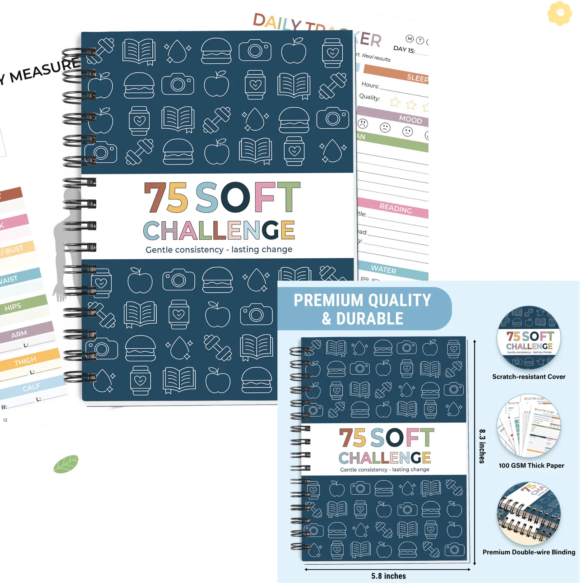 ·A5 PORTABLE SPIRAL DESIGN – ALWAYS BY YOUR SIDE — Compact A5 size (8.3 x 5.8 inches) slips easily into bags, purses, or gym totes; lay-flat spiral binding for effortless writing at home, work, travel, or workouts—your 75-day soft challenge companion wherever life takes you.
