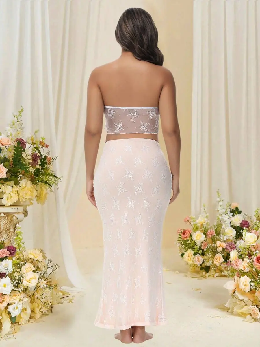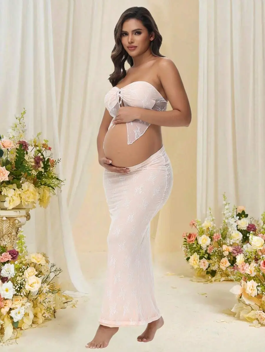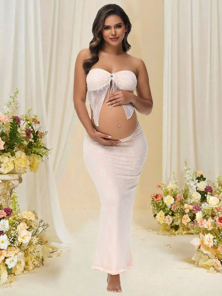 ELLIOTTWII Maternity Lace Bandeau & Hollow Out Skirt 2 Pieces Set, Suitable For Photoshoot And Baby Shower Spring