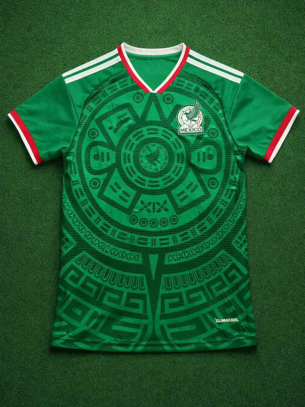 Mexico soccer jersey featuring a bold Aztec Calendar design across the front, combined with a premium embroidered logo for a unique and eye-catching look. The green version highlights traditional Mexican style, while the white version offers a clean, modern alternative.
