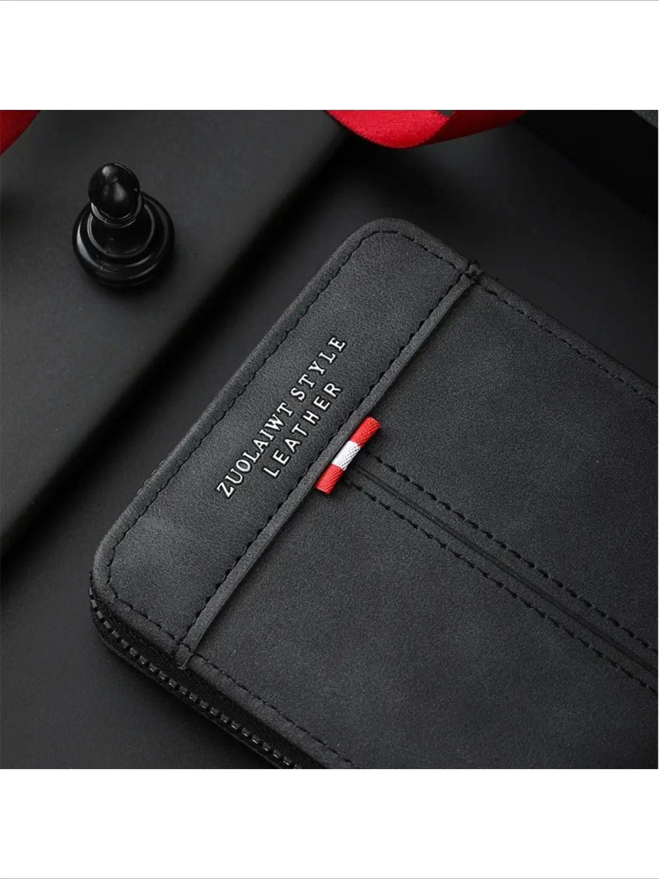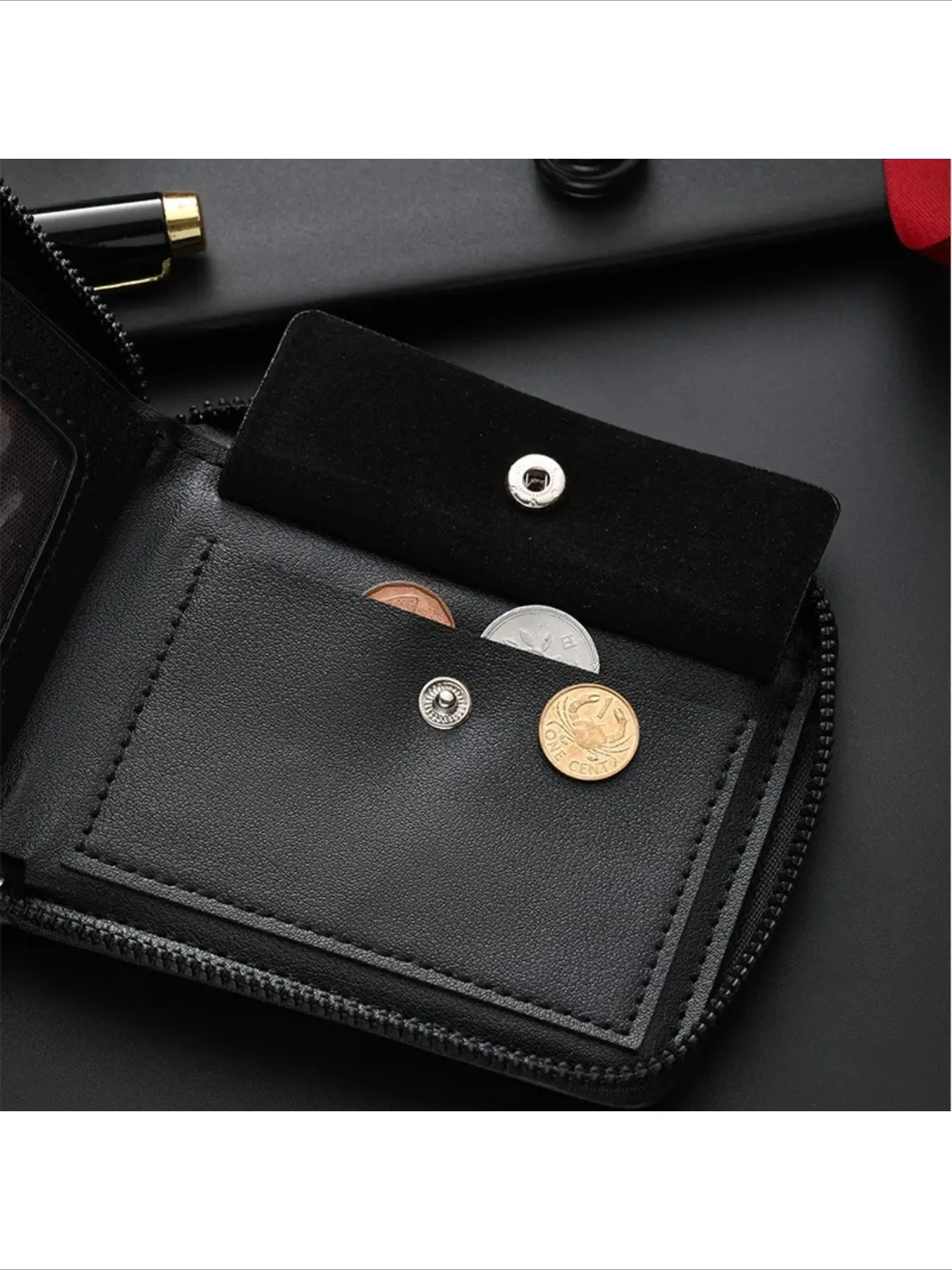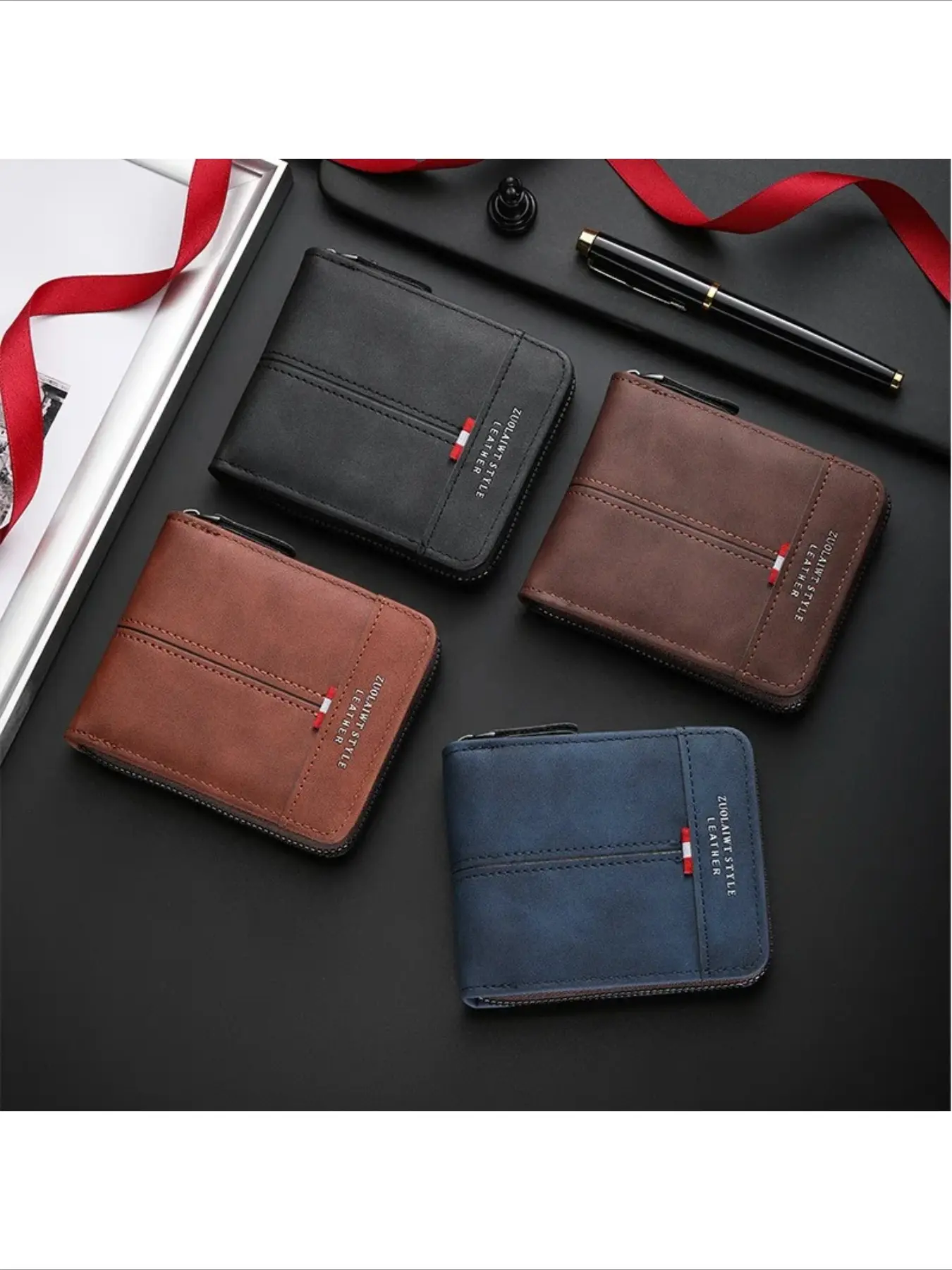 Men's Zipper Short PU Leather Wallet Woven Tape Spliced Leather Vintage Purse Multifunctional and Multi Card ID Money Bag