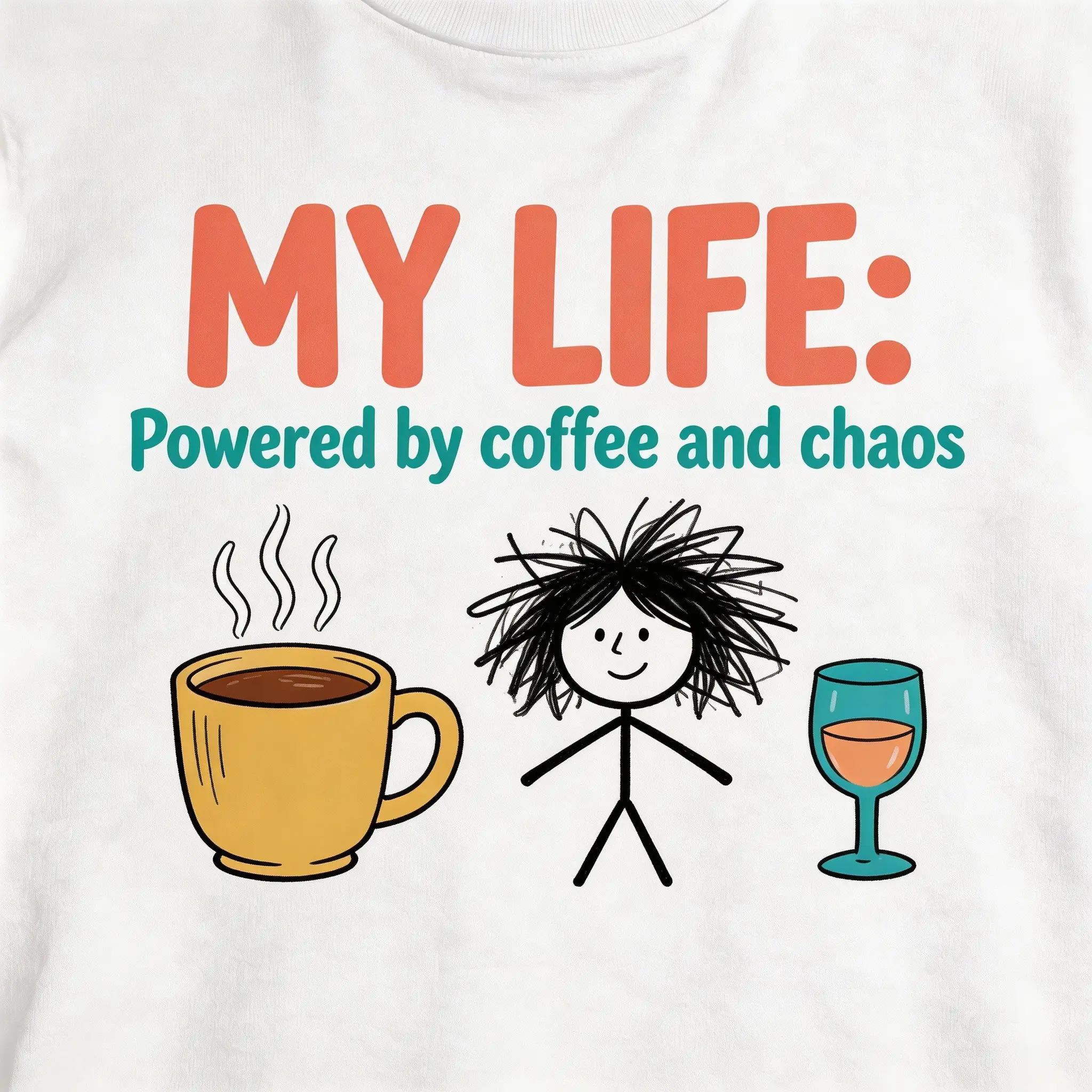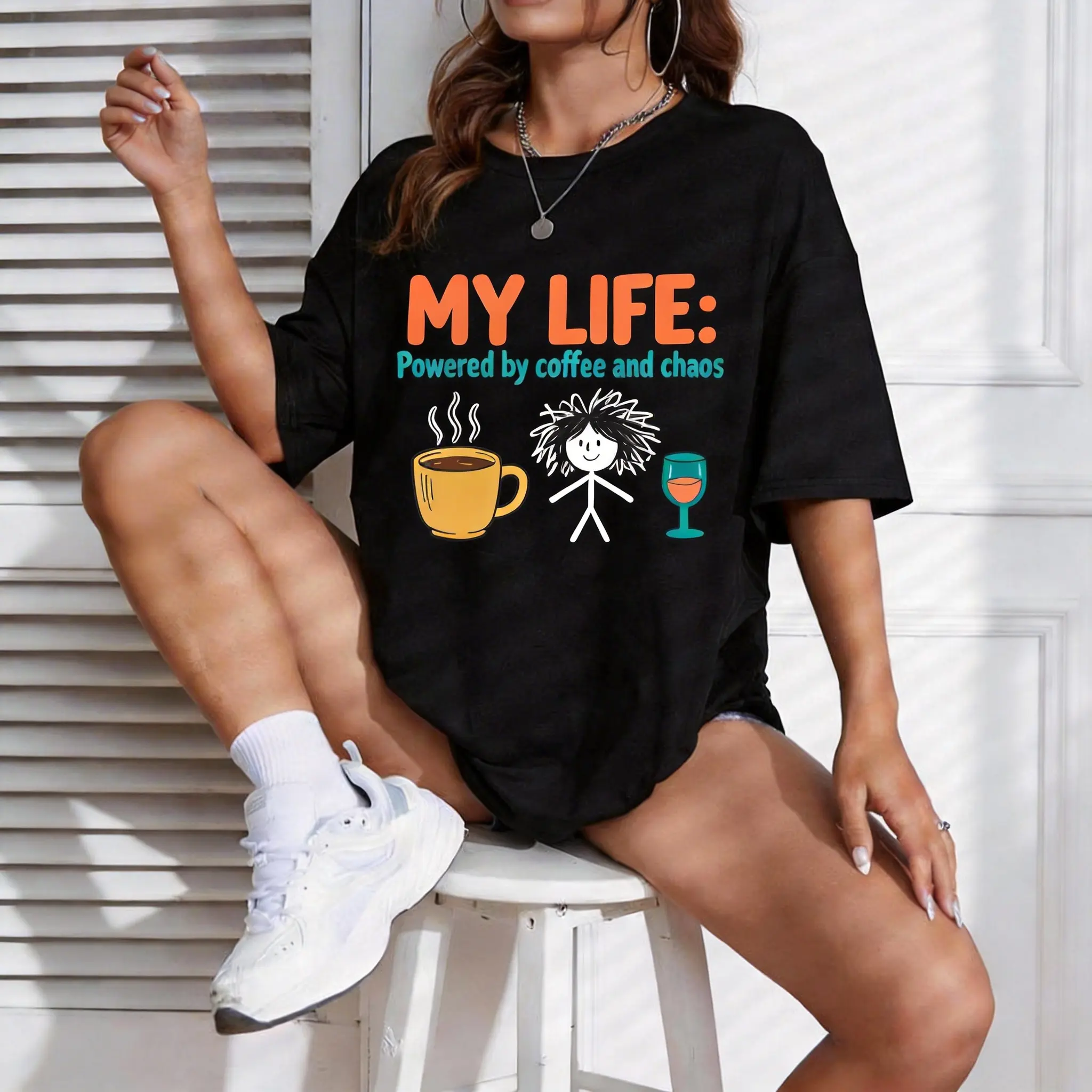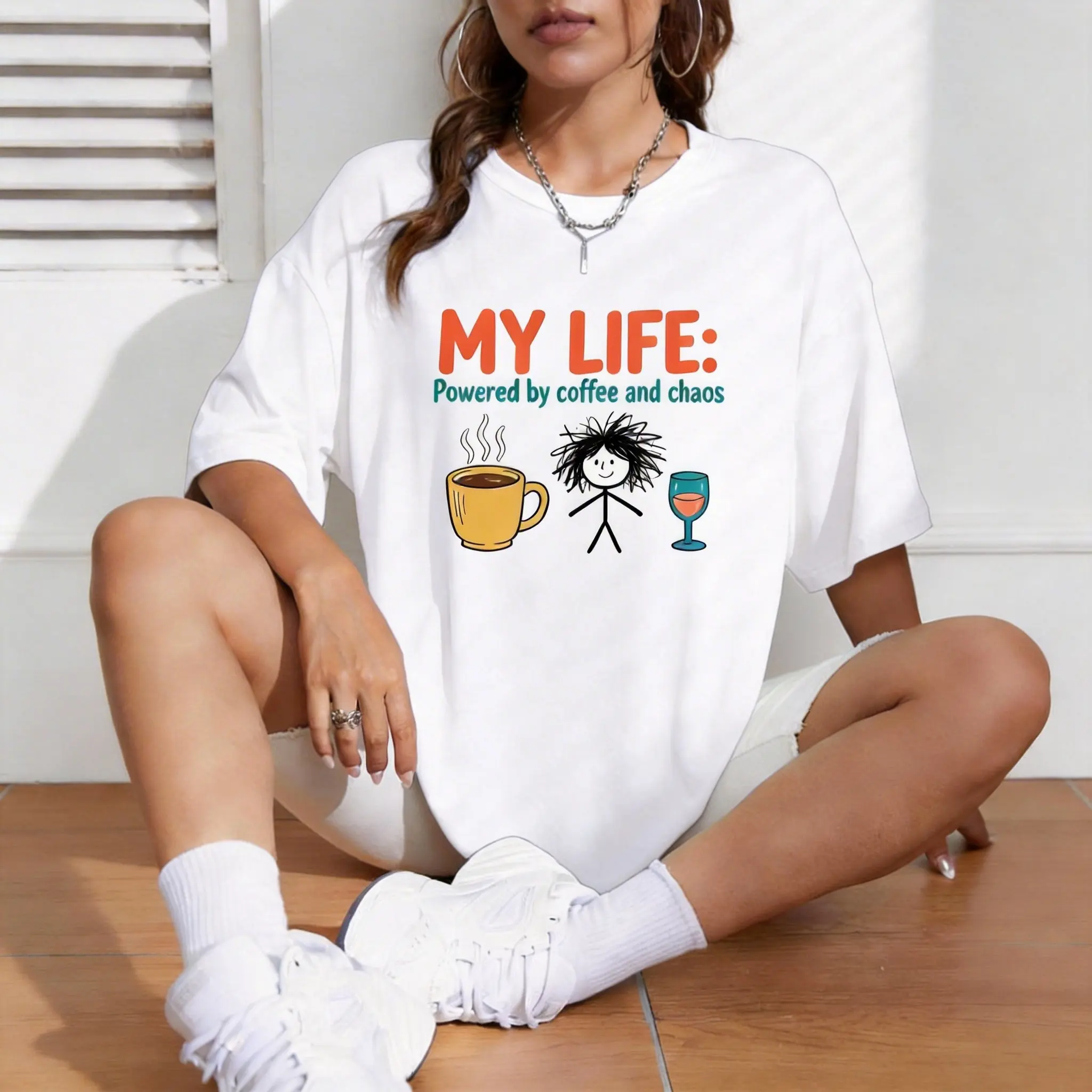 ✨ My Life Powered by Coffee and Chaos – This funny graphic tee is perfect for women who love a touch of humor in their wardrobe. The retro stick figure design adds a playful twist to your everyday look. Ideal for those who appreciate quirky, fun fashion statements.