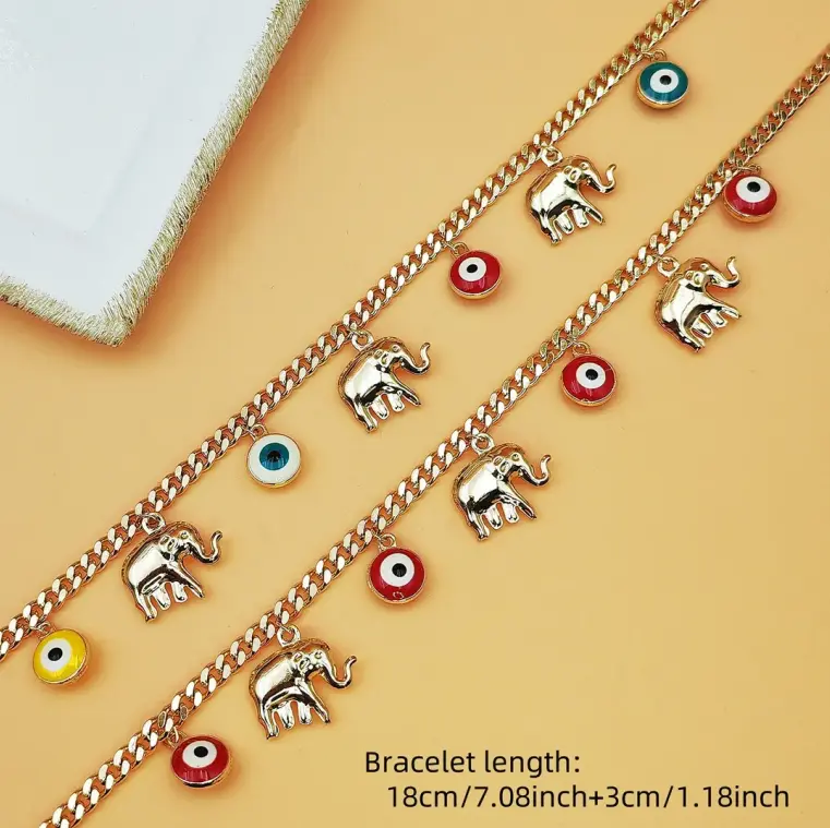 Gold Devil's Eye Bracelet with Baby Elephant Pendant Stylish Accessory: This bracelet features a gold chain adorned with devil's eye charms and baby elephant pendants. Perfect for adding a touch of elegance to any outfit. Adjustable Length Adjustable Length: The bracelet comes with an adjustable length, ensuring a comfortable fit for all wearers. Ideal for those who prefer a customizable fit. Versatile Design Versatile Design: The combination of devil's eyes and baby elephants makes this bracelet a versatile accessory suitable for various occasions. Enhance your style effortlessly. Gold Finish Gold Finish: The bracelet is crafted with a gold finish, giving it a luxurious and eye-catching appearance. A must-have for any fashion-forward individual.