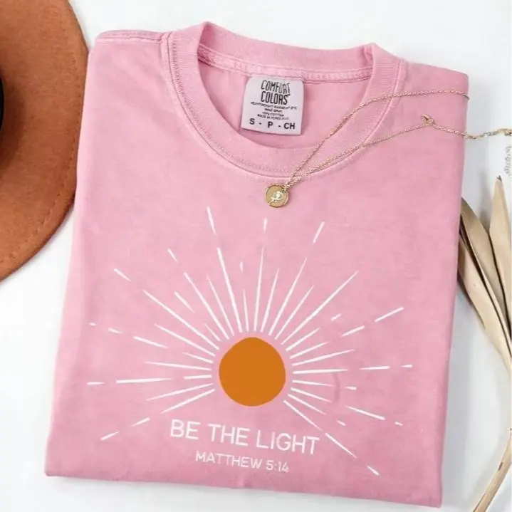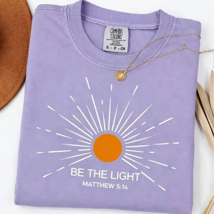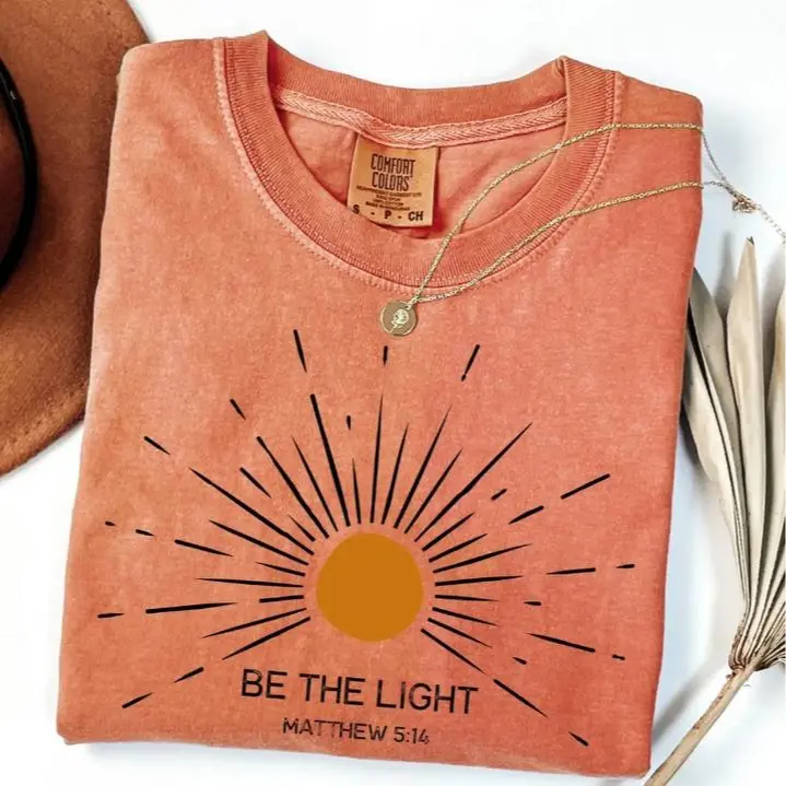 Shine your faith with this Be The Light Christian T-Shirt ️️. Inspired by the powerful message from Matthew 5:14, this tee is a beautiful reminder to live boldly and reflect light in the world every day