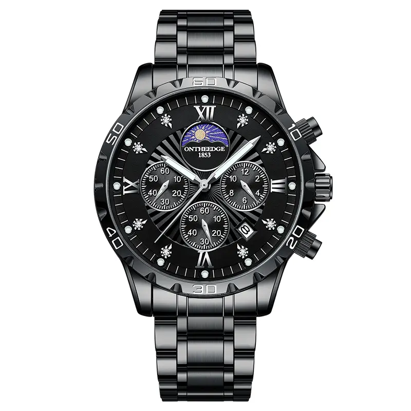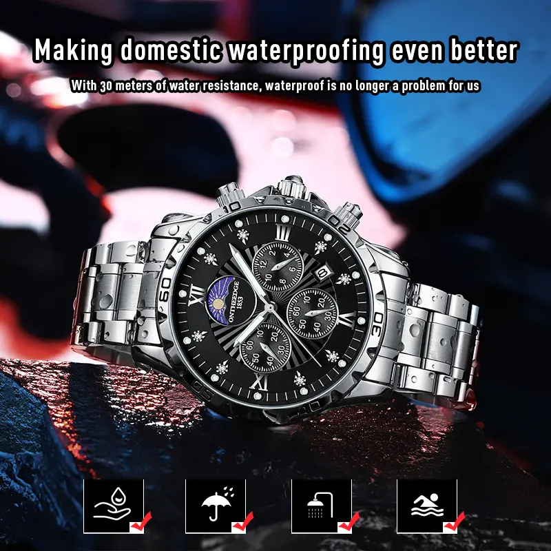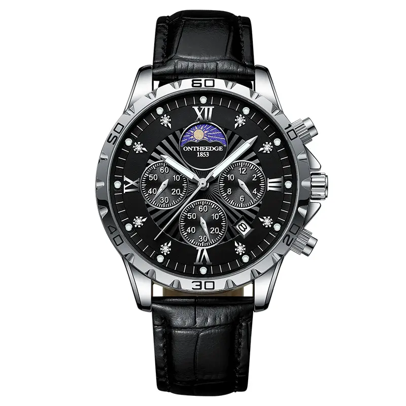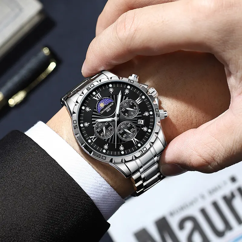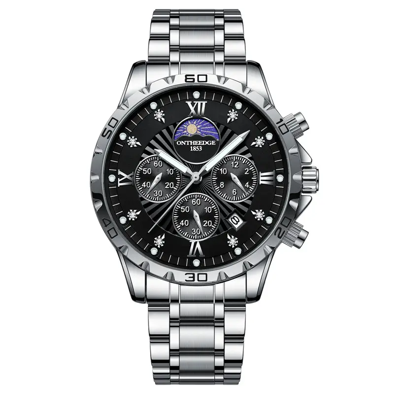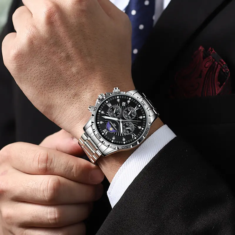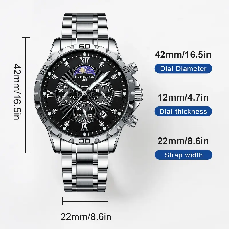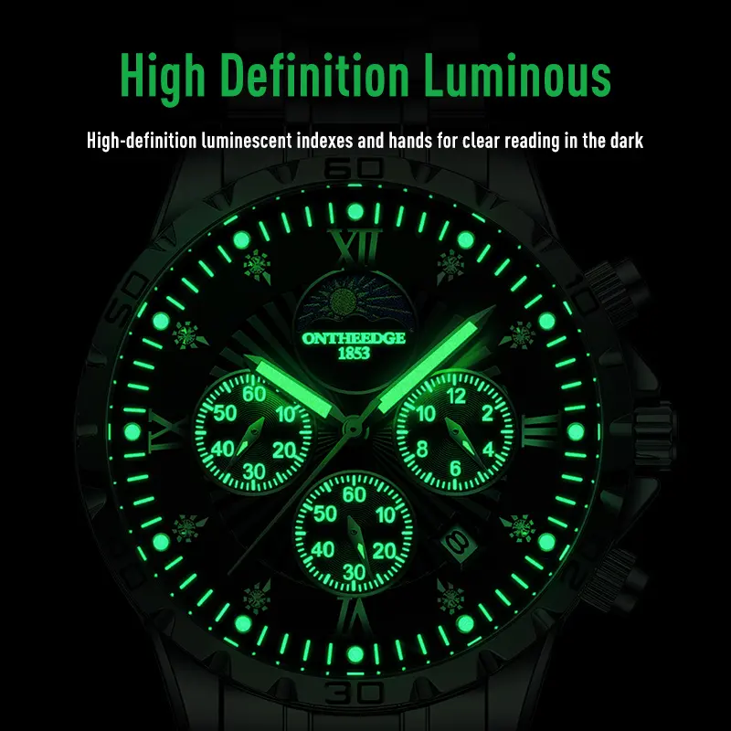 Men's Luxury Moon Phase Quartz Watch - Stainless Steel Wristwatch with Date, Chronograph Subdials, Diamond Markers, Luminous Hands, Classic Business Dress Watch for Men, Perfect Gift for Husband Dad