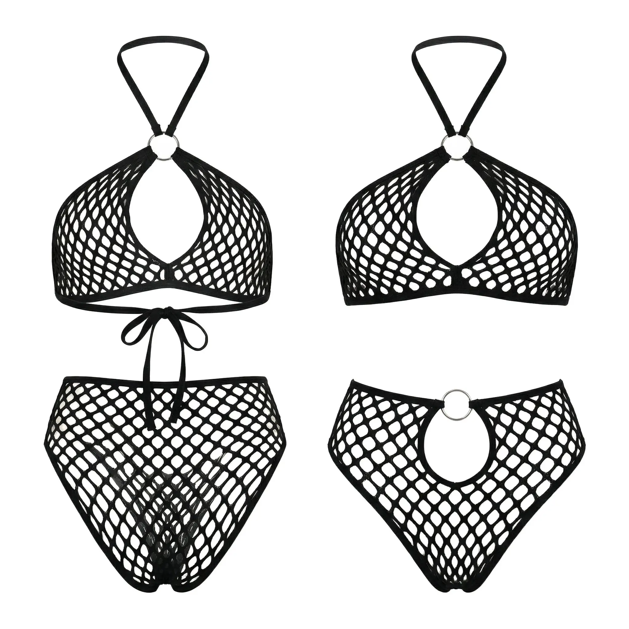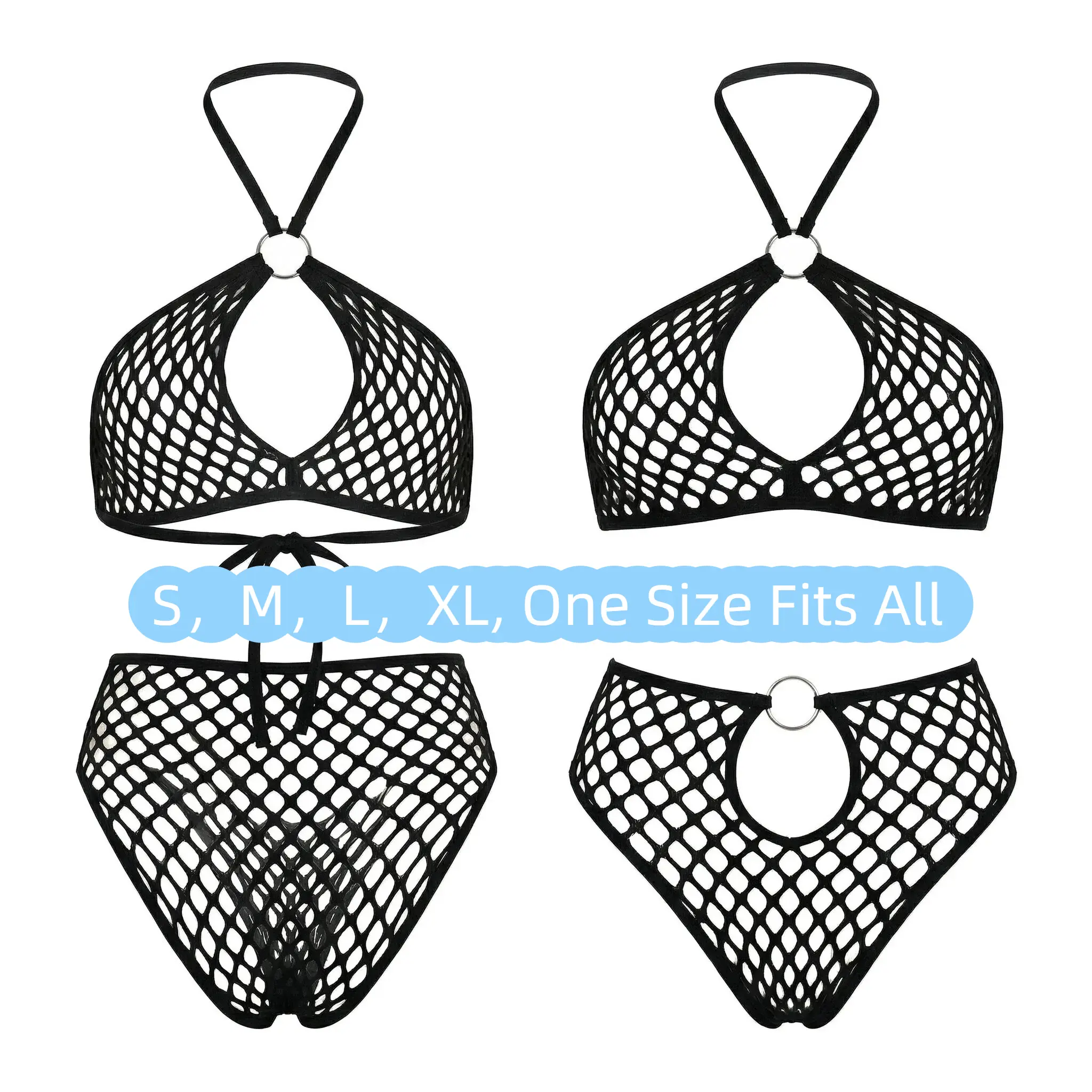 【Package Includes】 Set includes one hollow-out halter bikini top and one matching high-waisted fishnet bottom.
