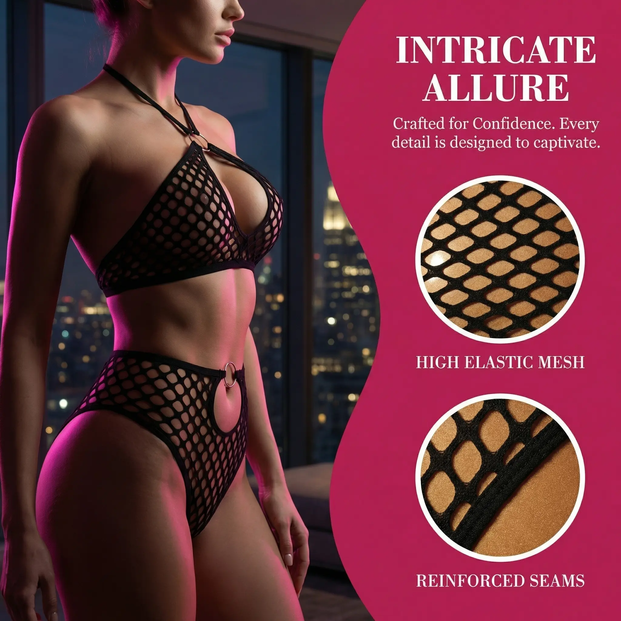 SILIX Chic Fishnet Halter Lingerie Set | One Size Fits All | Sexy Feminine Lingerie Set Underwear | Summer Sleepwear For Women